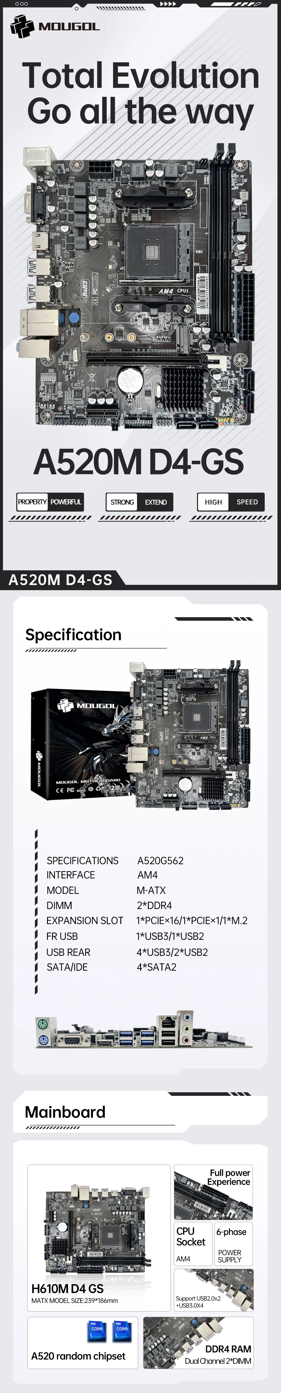 • Memoria DDR4 de alto rendimiento: la placa base MOUGOL A520M D4 admite memoria DDR4 de hasta 3200 MHz, proporcionando un rendimiento de alta velocidad para aplicaciones exigentes.