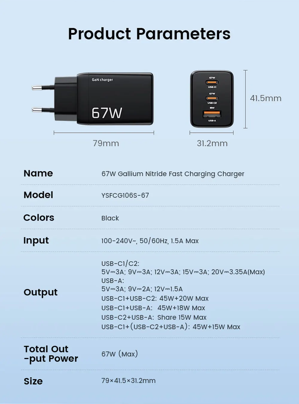 USB-CI/USB-C2 single port outputs 67W, USB-A single port outputs 18W
