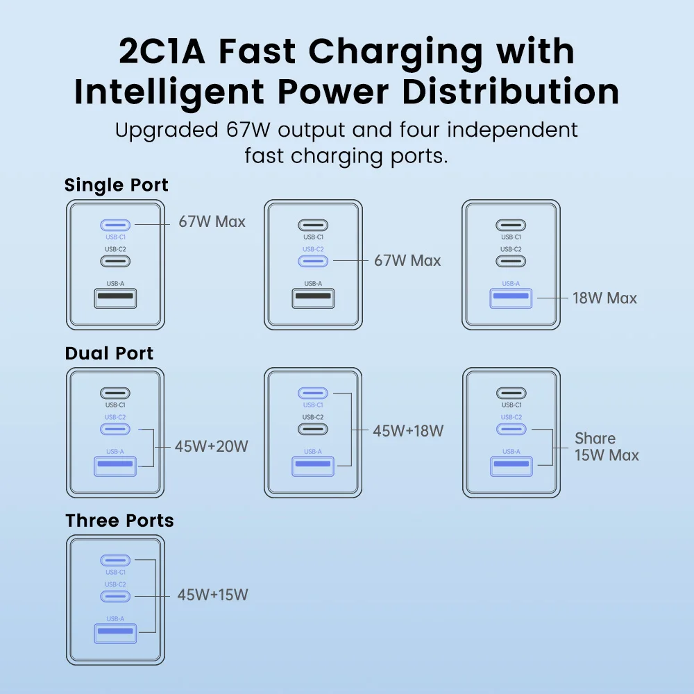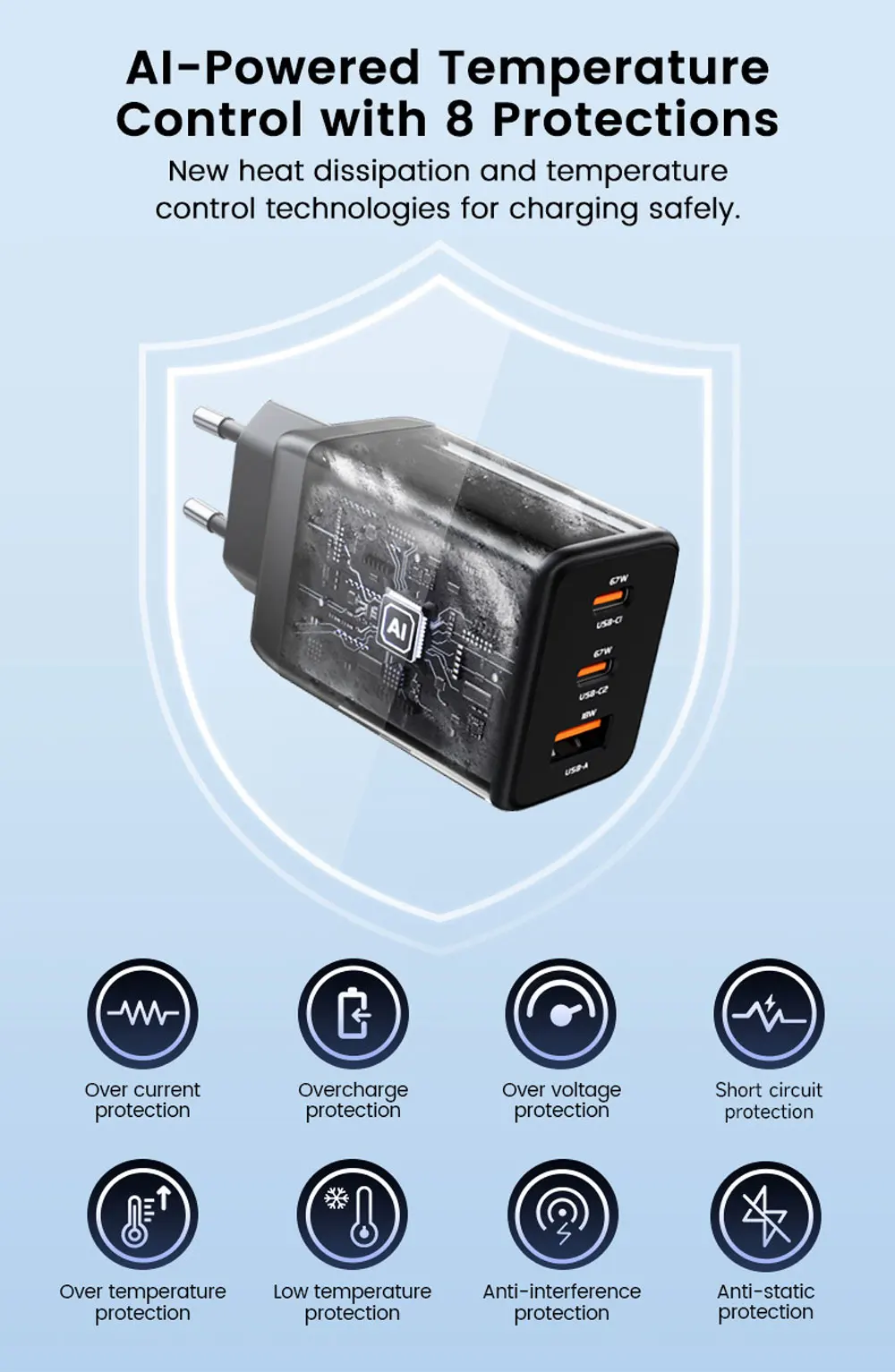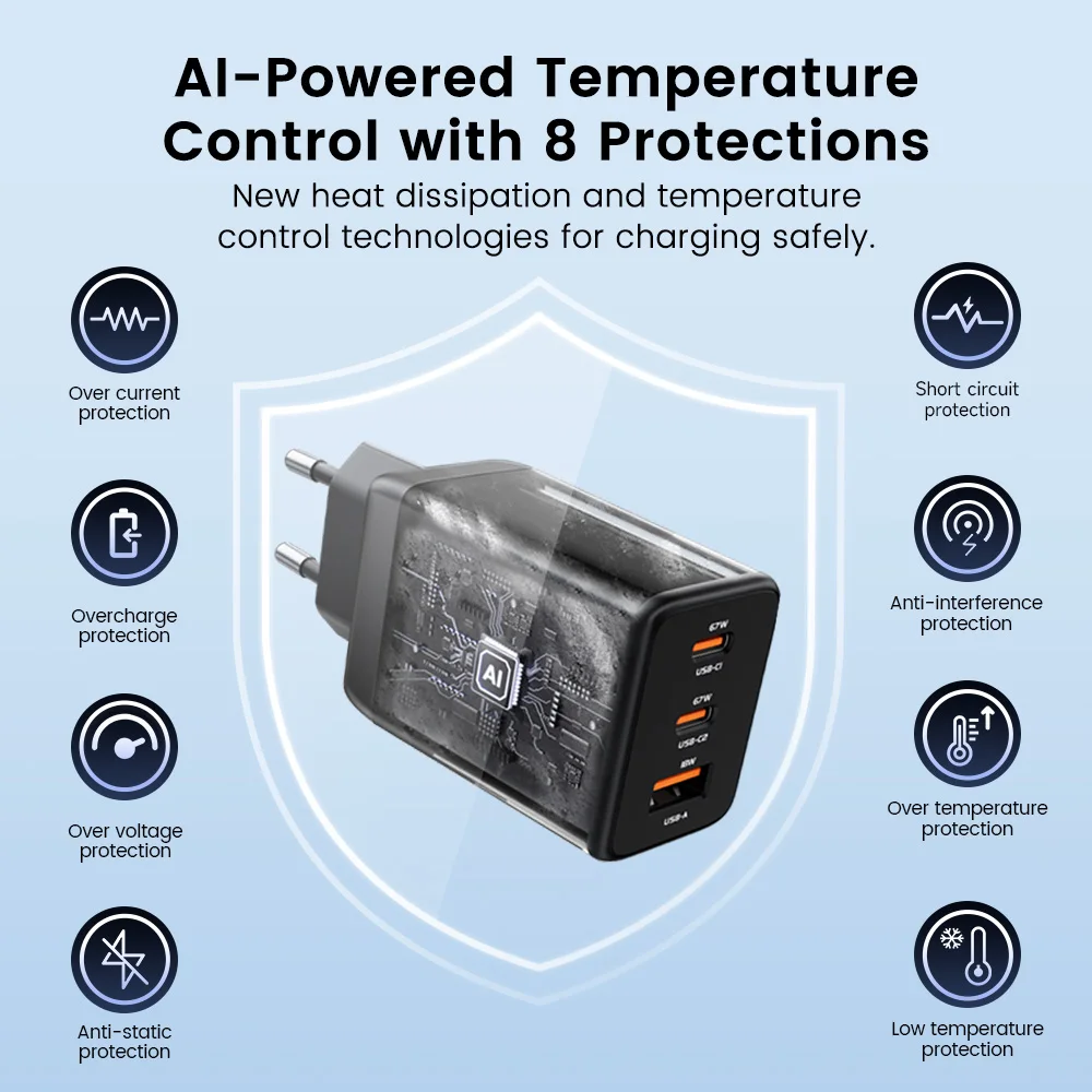 67W Fast Charging | Type-C* 2 and USB-A* 1 | Advanced GAN Tech | Intelligent Temperature Control | Broad Compactibility