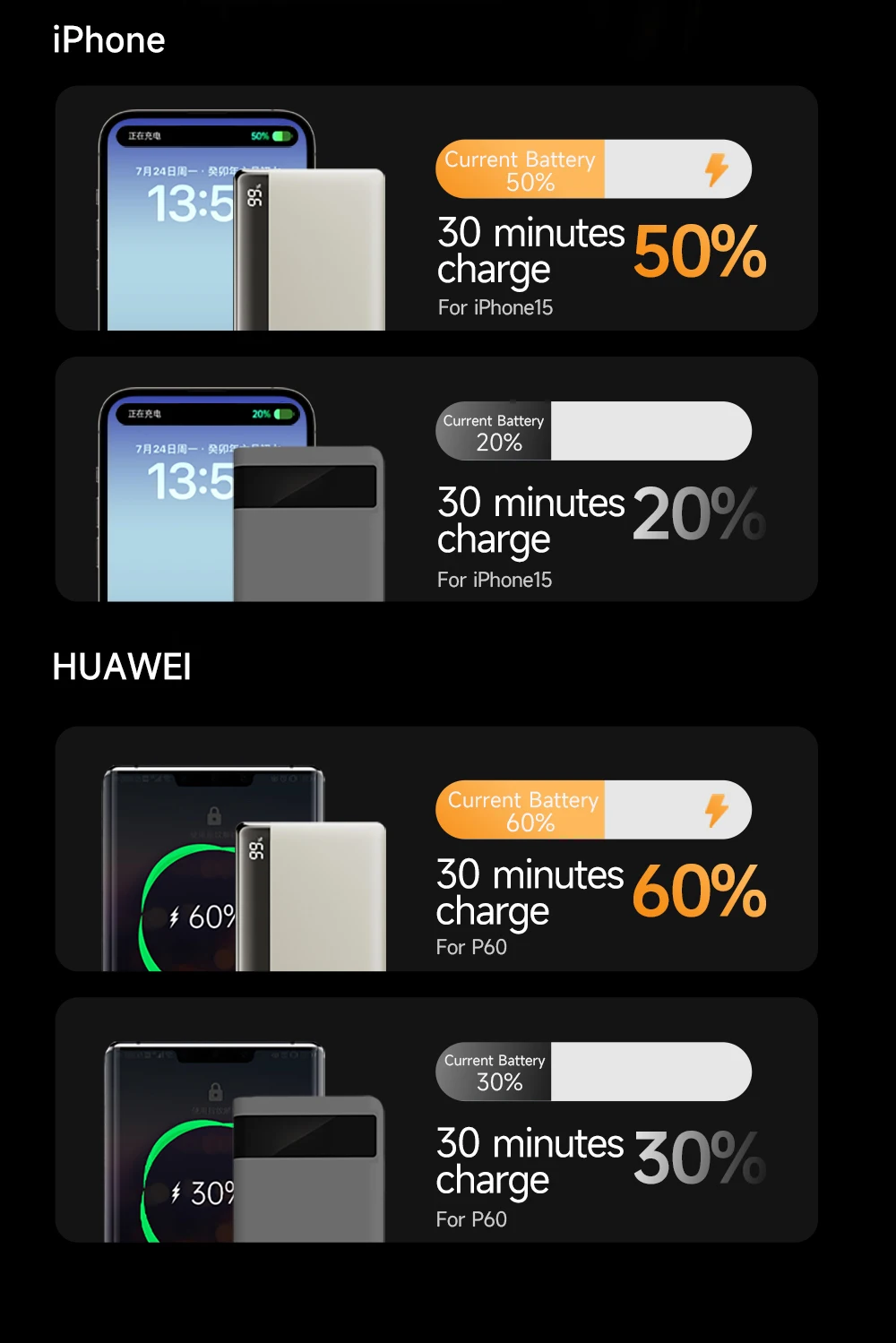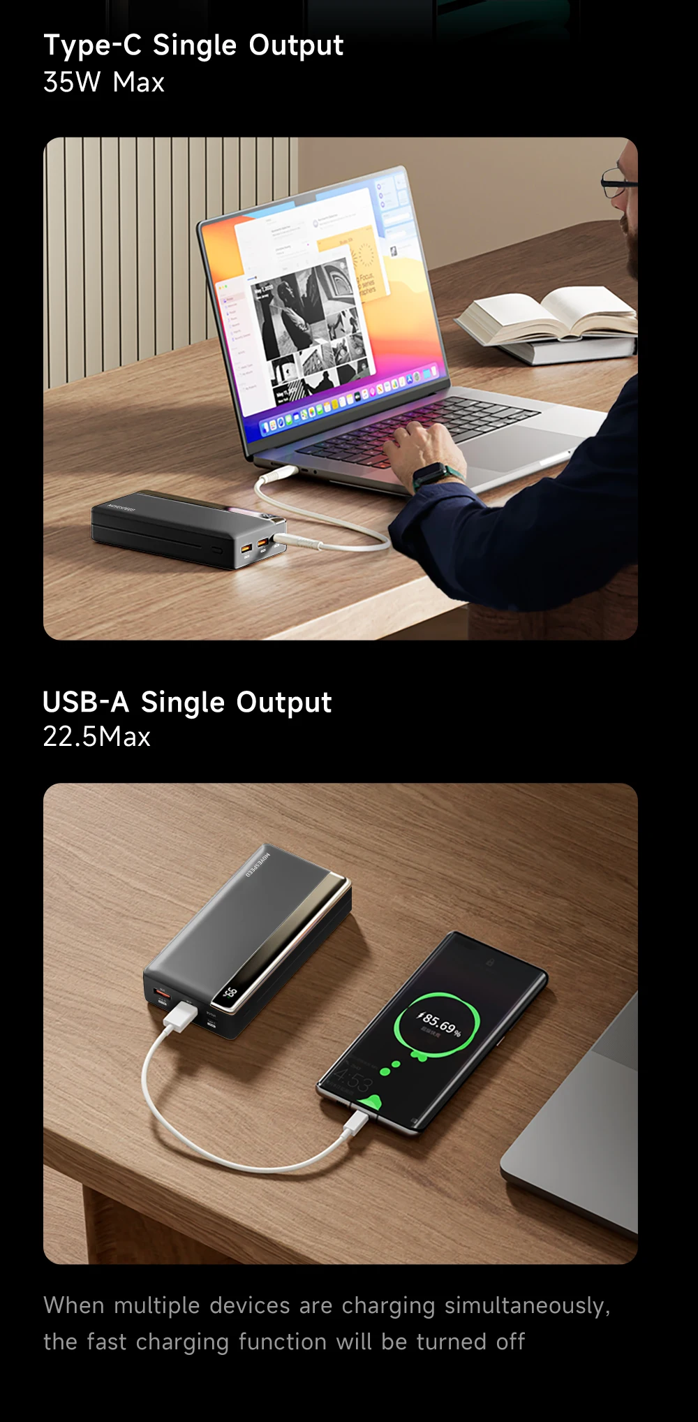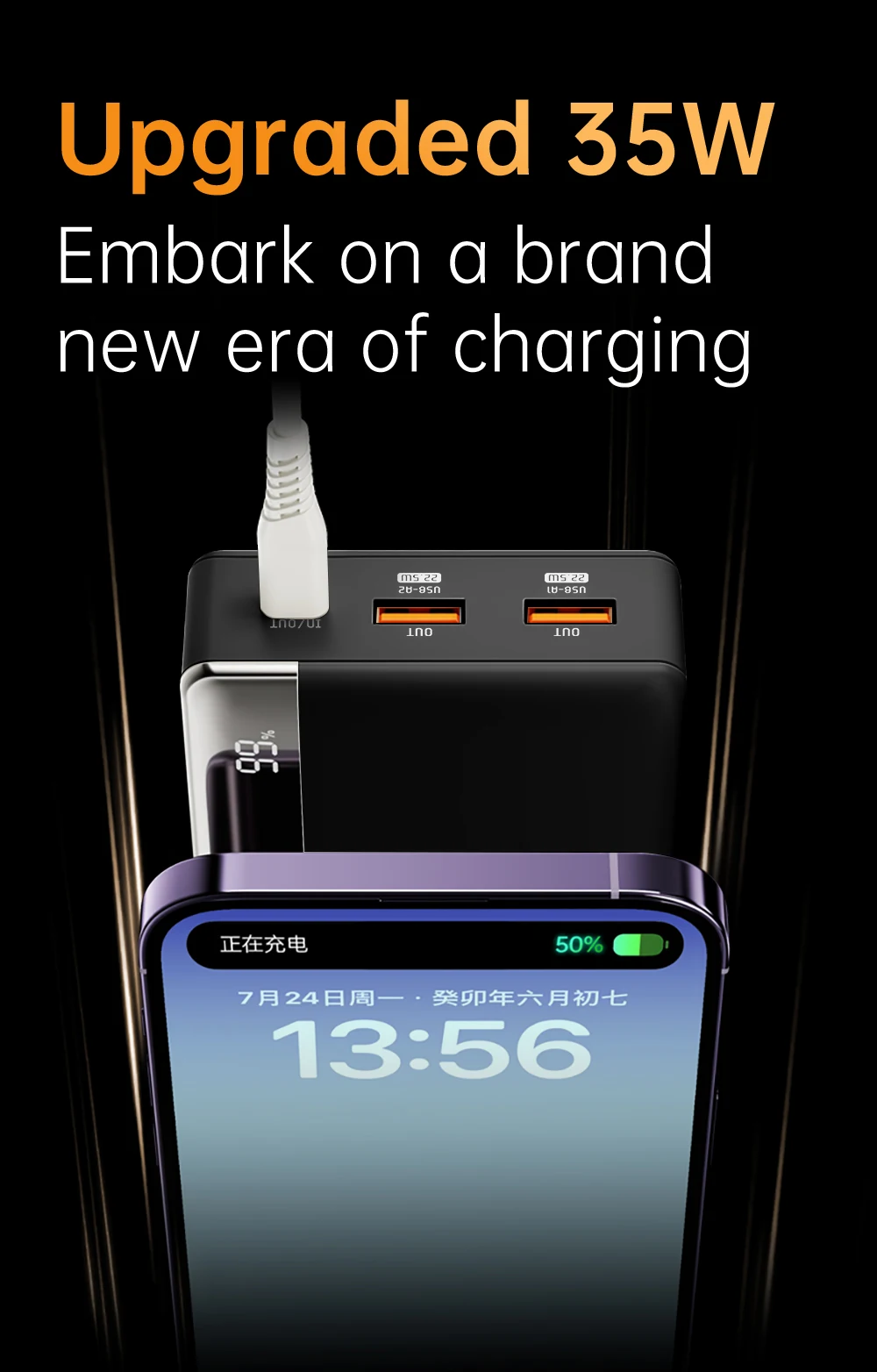 ● Suministro de energía de 35 W: ofrece carga rápida de 35 W con PD3.0 y QC3.0, alcanzando el 50% en 30 minutos.