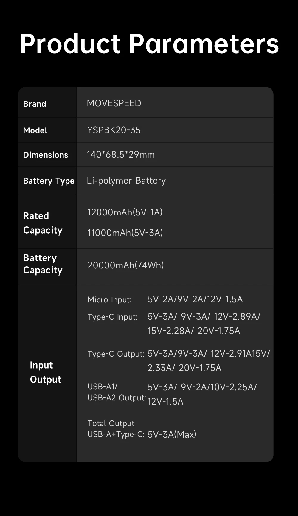 Modelo: Banco de energía MOVESPEED 20000mAh