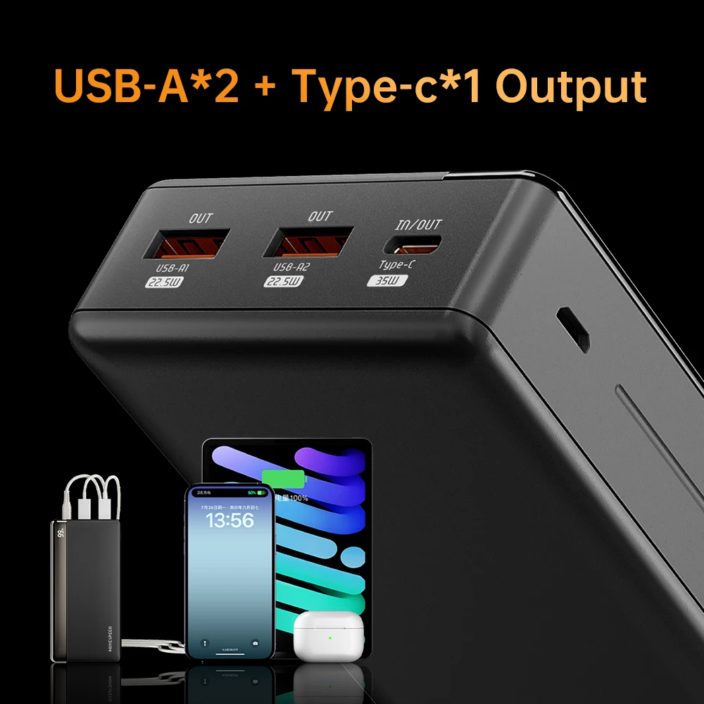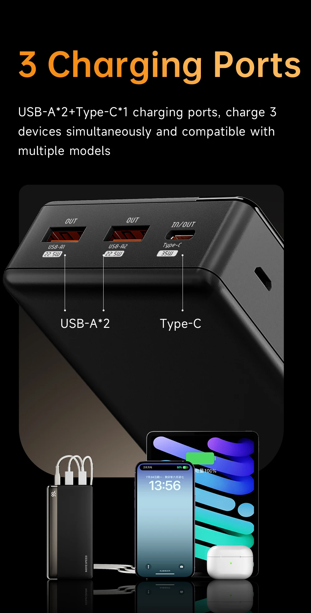 Puertos de carga USB-A*2+Tipo-C*1, carga 3 dispositivos simultáneamente y es compatible con múltiples modelos