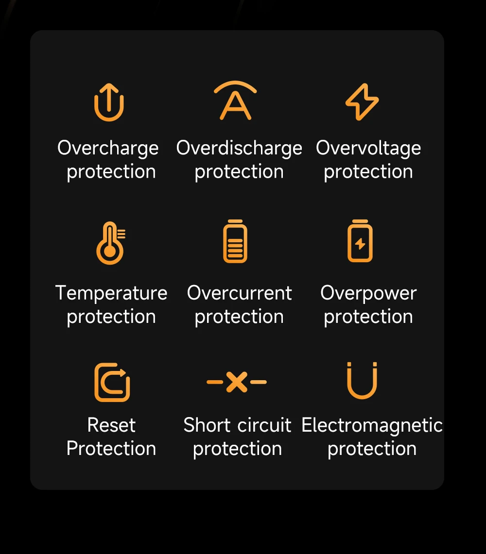 Nuestro producto tiene múltiples protecciones, por lo que puedes usarlo con confianza.tales como: protección contra sobrecarga, protección contra sobredescarga, protección contra sobretensión, protección de temperatura, protección contra sobrecorriente, etc.