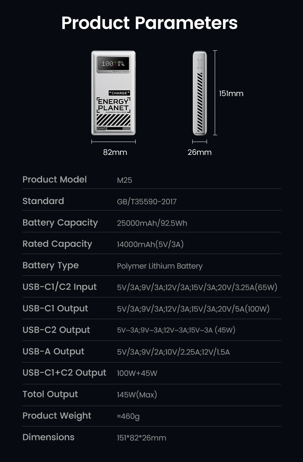 ● Gran capacidad de 25000 mAh, proporciona aproximadamente 1,5 cargas para MacBook Pro 14", 4,8 cargas para iPhone 16