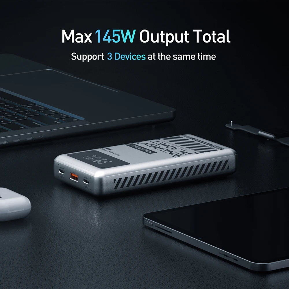 ● Salida total de 145 W.Equipado con dos puertos USB-C y un puerto USB-A con un total de 145 W de salida, cargue rápidamente una computadora portátil a 100 W para obtener la máxima eficiencia.