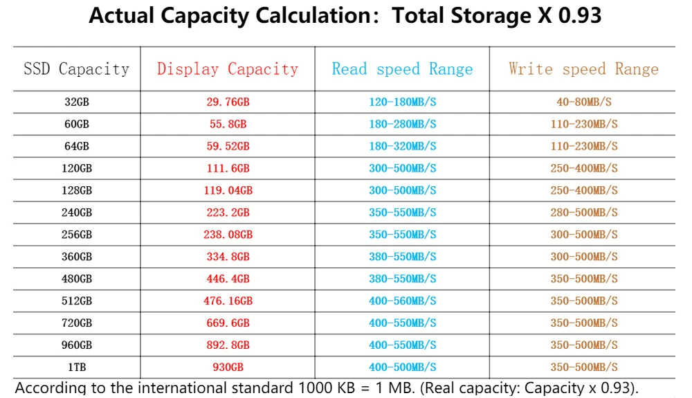 De acuerdo con el estándar internacional 1000 KB=1 MB, la capacidad real=Capacidad x 0,93, tenga en cuenta eso.