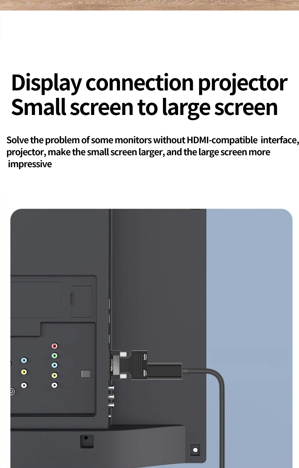 El producto se usa ampliamente como entrada de fuente de señal compatible con HDMI para dispositivos como computadoras de escritorio, portátiles, teléfonos móviles, DVD, tabletas, decodificadores digitales, reproductores, cámaras digitales, DSLR y videocámaras. Después de conectarse a través de este adaptador, permite la salida de dispositivos de visualización como televisores, monitores y proyectores. Esto resuelve el problema de conectar dispositivos de visualización del usuario.