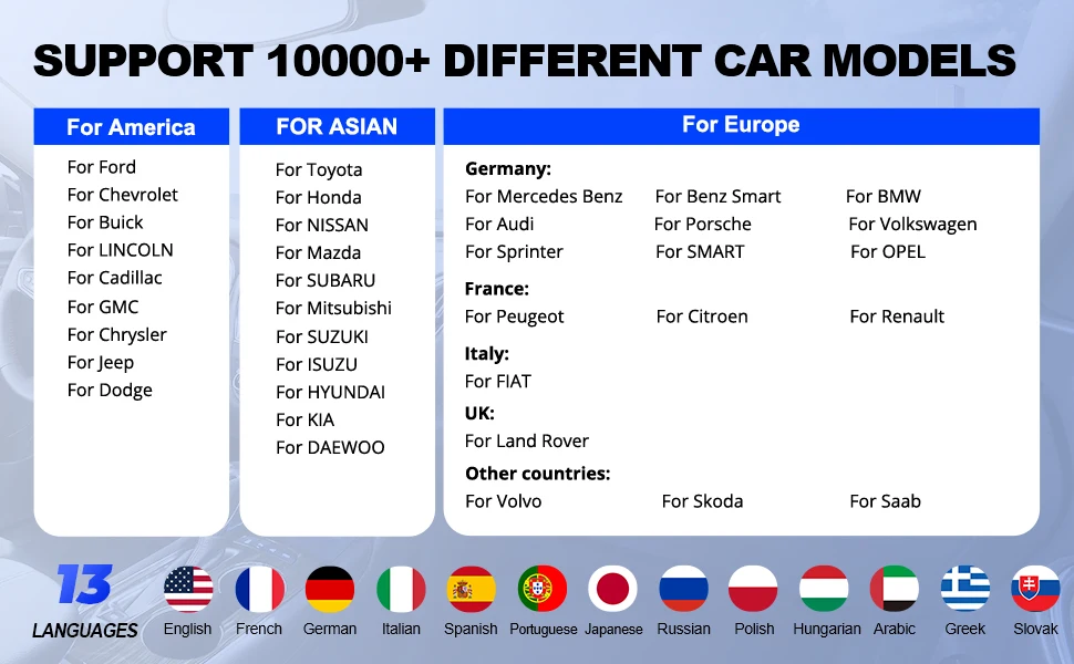 Para Aston Martin, para Audi, para Alfa Remeo, para Abarth, para BMW, para Bentley, para Bugatti, para Citroen, para DR, para Dacia, para UE Ford, para Ferrari, para Fiat, para GAZ, para Iveco, para IZH, para Jaguar, para Land Rover, Para Lamborghini, para Lancia, para Mercedes, para Maserati, para Maybach, para Mini, para Opel, para Opel (Sudáfrica), para PAZ, para Peugeot, para Porche, para Renault, para Rover, para Rolls-Royce, para Saab, para asiento, para Skoda, para Smart, para Sprinter, Para UAZ, para VAZ, para Volvo, para Volkswagen, para Vauxhall, para ZAZ