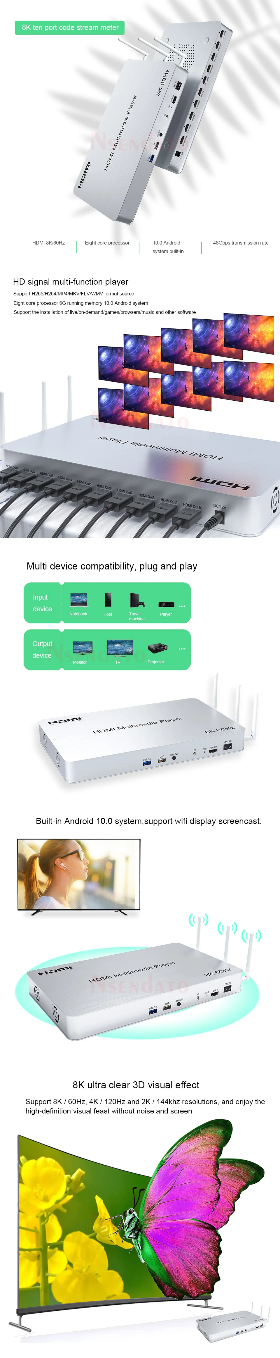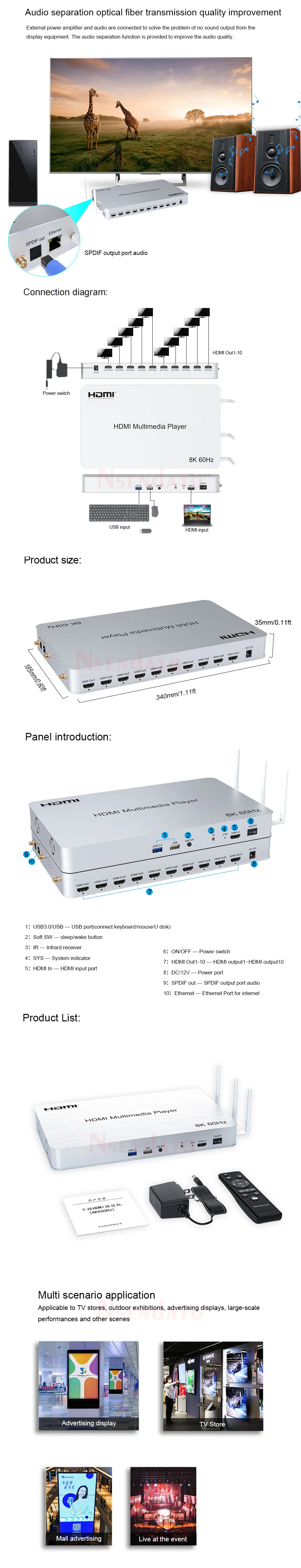 IntroducirInserciones de reproductor multimedia HDMI de 10 vías con ARM Cortex A73 octa-core CPU y Mali GPU G25MC6,6G DDR4. Android 10,0 sistema admite la instalación en vivo, bajo demanda, juegos, navegación web, música y otro software, admite reproducción 2K, 4K,8K Ultra HD. Este reproductor multimedia de 10 vías es ampliamente utilizado en tiendas de TV, proyectos y otras ocasionesCaracterísticasApoyo HDR;Soporta resolución de hasta 8K a 60Hz;Admite una tasa de ancho de banda máxima ouptput de 48Gbps;Soporta 8/10/12 espacio de color;Admite WIFI, conexión DLAN;Compatible con el sistema Android 10,0, Compatible con pantalla wifi;.Admite Extracción de audio, Salida por SPDIF;Transmisión USB bidireccional, compatible con reproducción de vídeo USB y actualización USB;.Admite 10 formas de salida HDMI simultáneamente;IR de apoyo;Admite teclado y ratón;Admite la configuración de resolución a través del control remoto o el ratón USB;Especificaciones:Resolución de entrada HDMI: 8K/60Hz más altoResolución de salida HDMI: 8K/60Hz más altoAdmite formato de audio: estéreoCable de entrada de distancia: 8K/60Hz ≤ 5M HDMI 2,1 cable estándarCable de salida distancia: 8K/60Hz ≤ 5M HDMI 2,1 cable estándarCorriente de funcionamiento máxima: AAdaptador de corriente: entrada AC (50HZ 60HZ) de 100V-240V; Potencia de salida: DC 12V/2ALista de paquetes:10 vías reproductor de mediosAdaptador de corriente 12V/2AManual de usuarioControl remoto