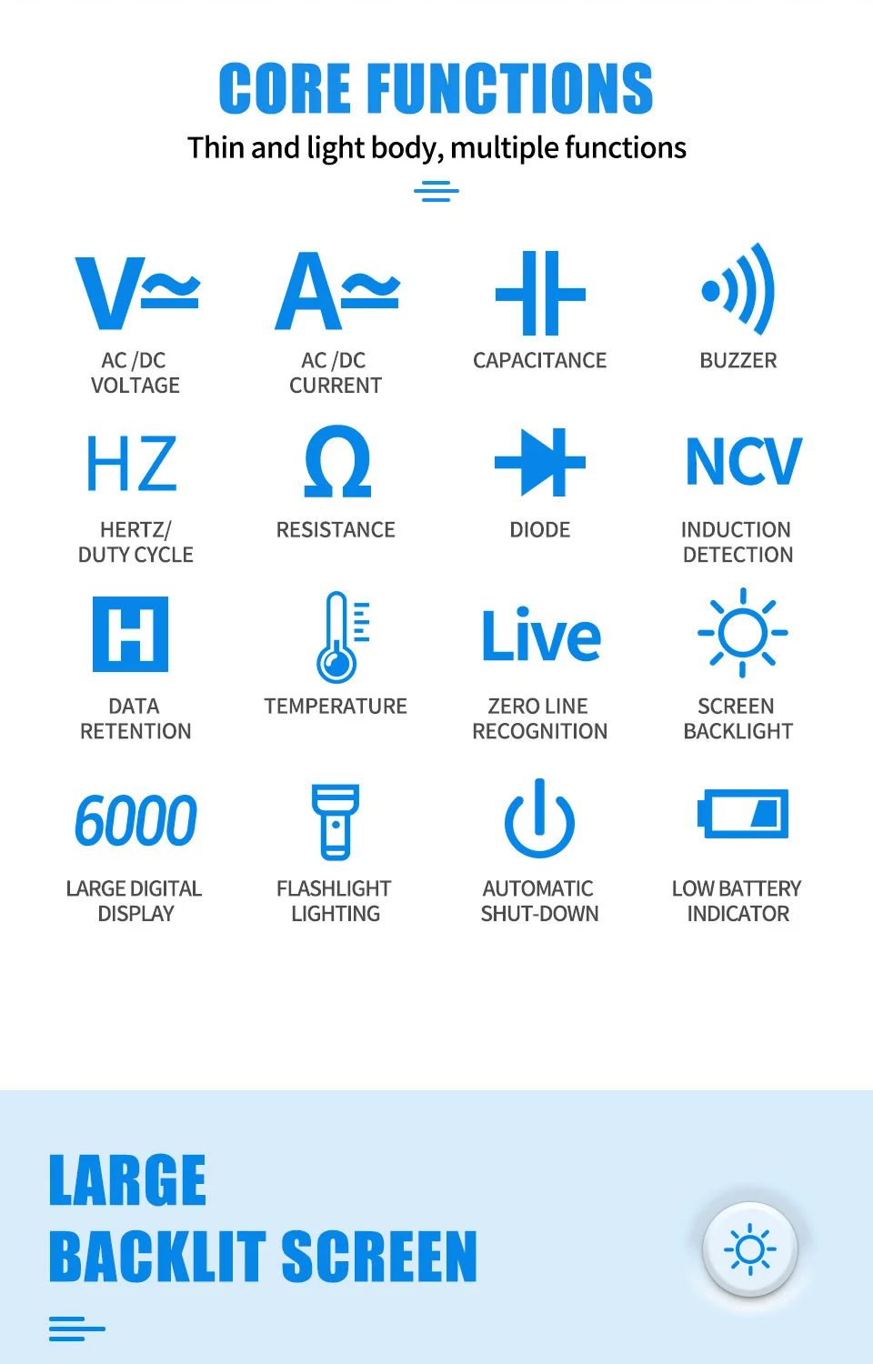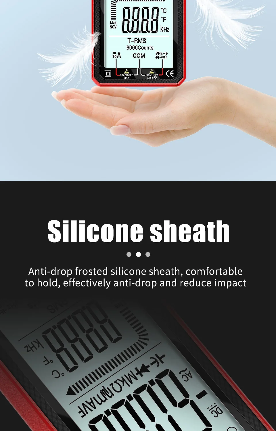 • Pantalla de recuento grande:Con 6000 recuentos, la pantalla digital proporciona un recuento grande y fácil de leer, lo que facilita la comprensión de sus mediciones.
