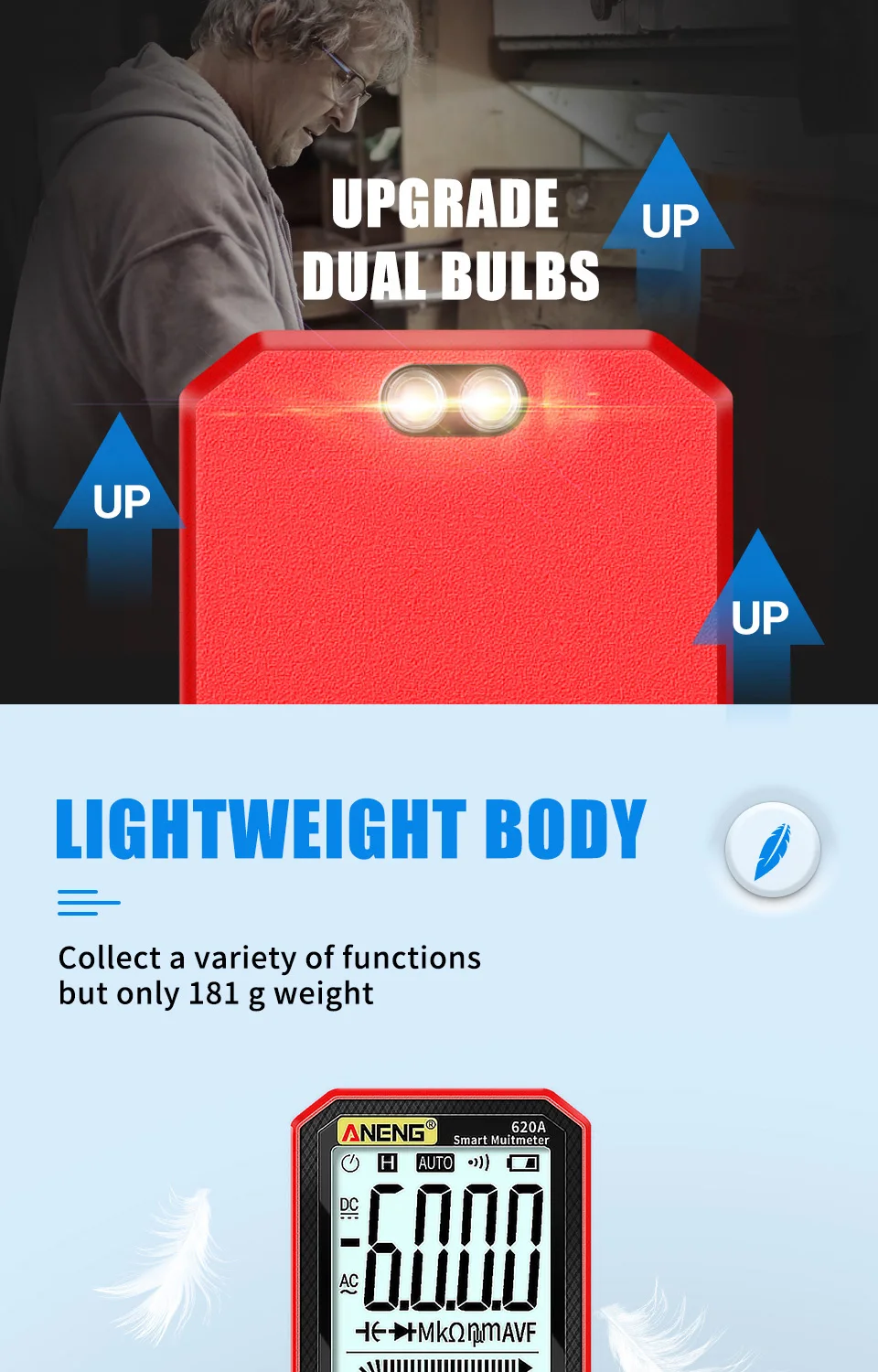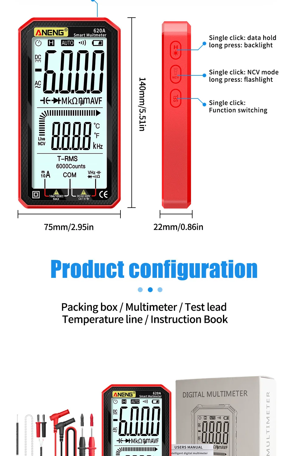• Medición RMS verdadera:El multímetro ANENG 620A proporciona una medición RMS real, asegurando lecturas precisas de capacitancia, resistencia y temperatura.