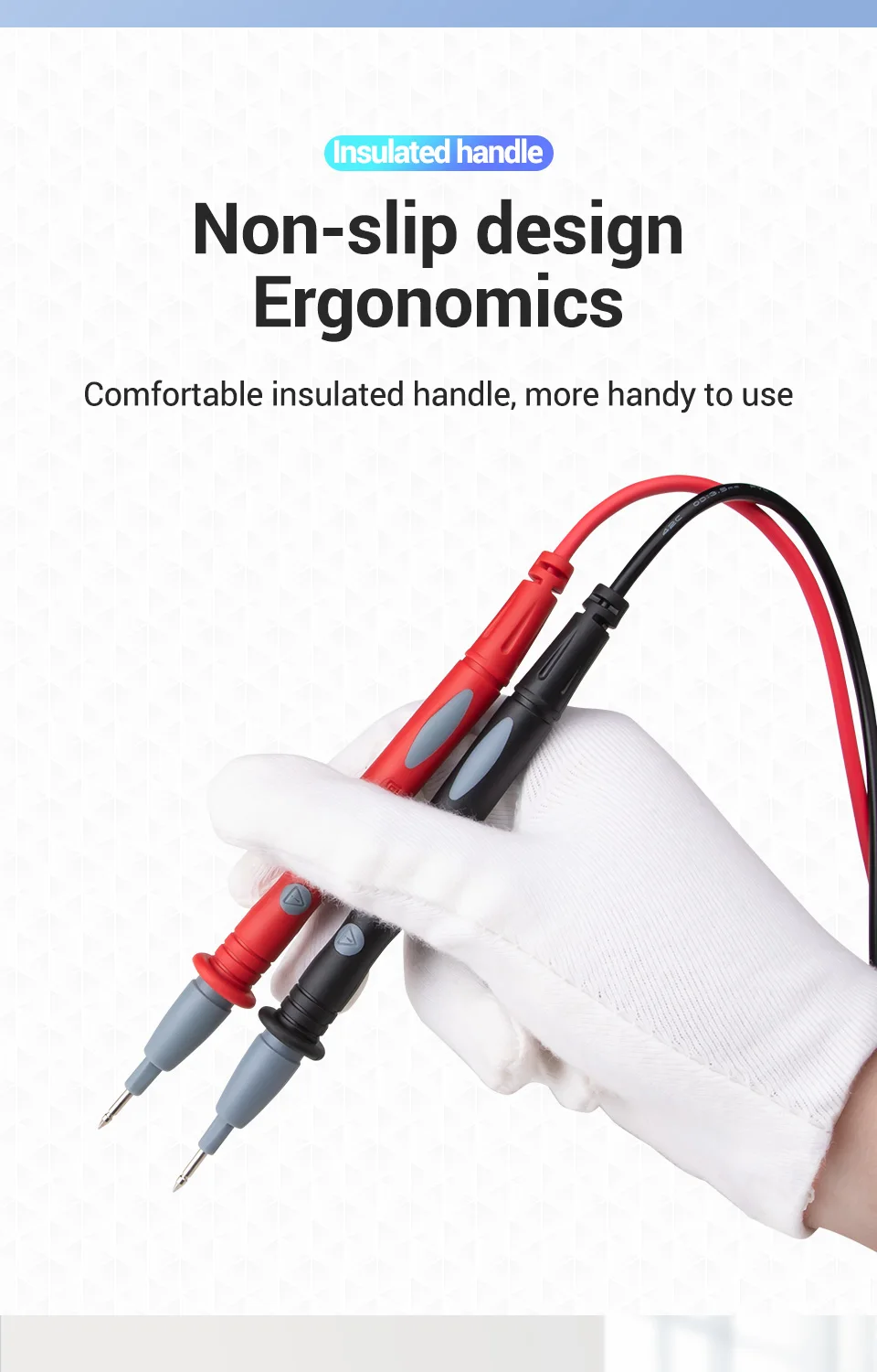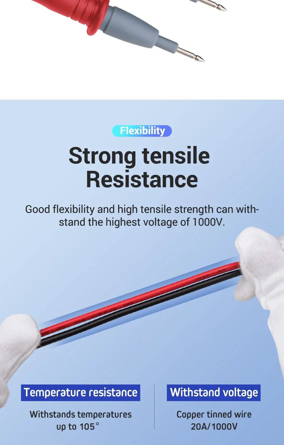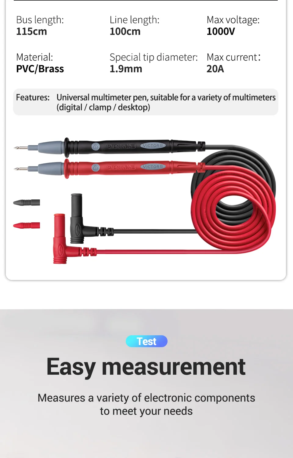 Cables de prueba fáciles de usar: fabricados con aislamiento de PVC, los cables de prueba son duraderos, flexibles y fáciles de manejar al probar el equipo.