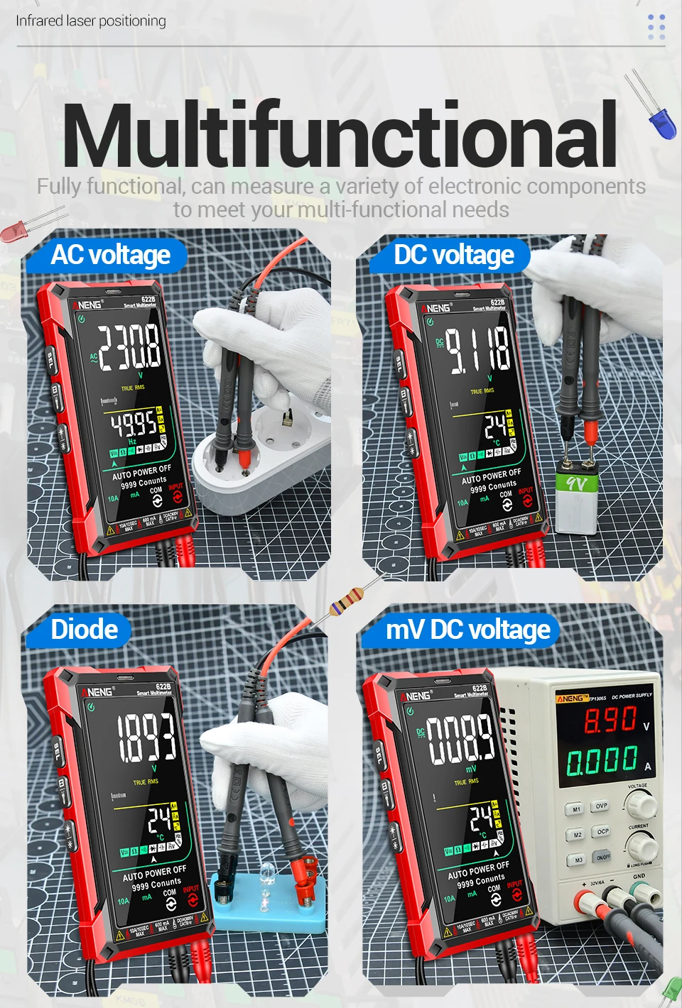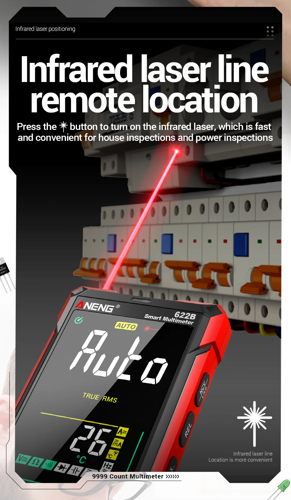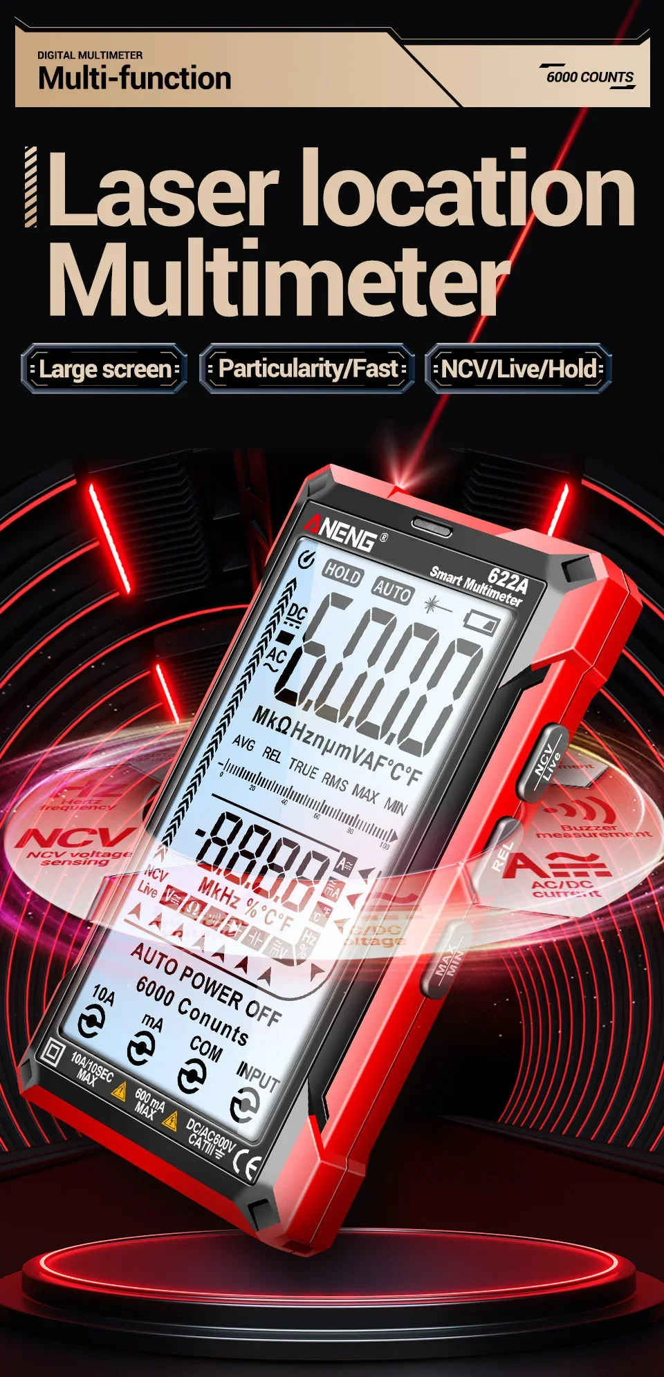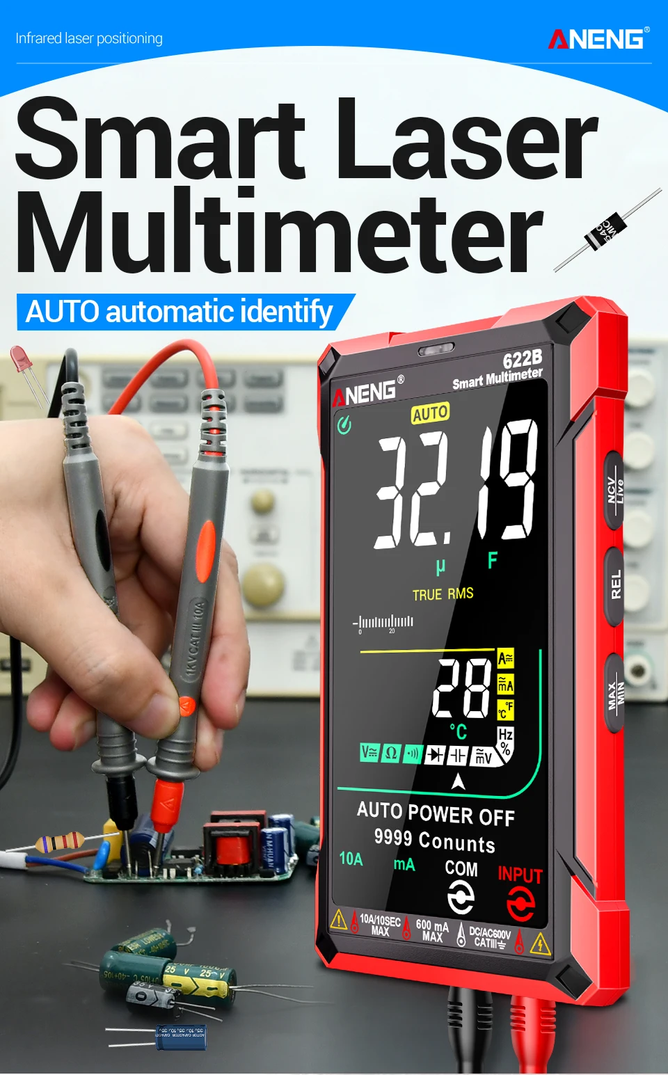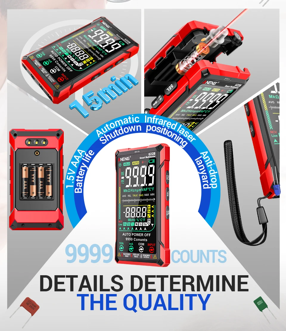 Multímetro ANENG 622A/622B con lámpara láser Medidor probador inteligente 10A Rango automático True RMS Voltaje CC/CA Pantalla analógica Multitester Capacitancia REL Ohm Diodo NCV Hz Herramientas de medida DMM