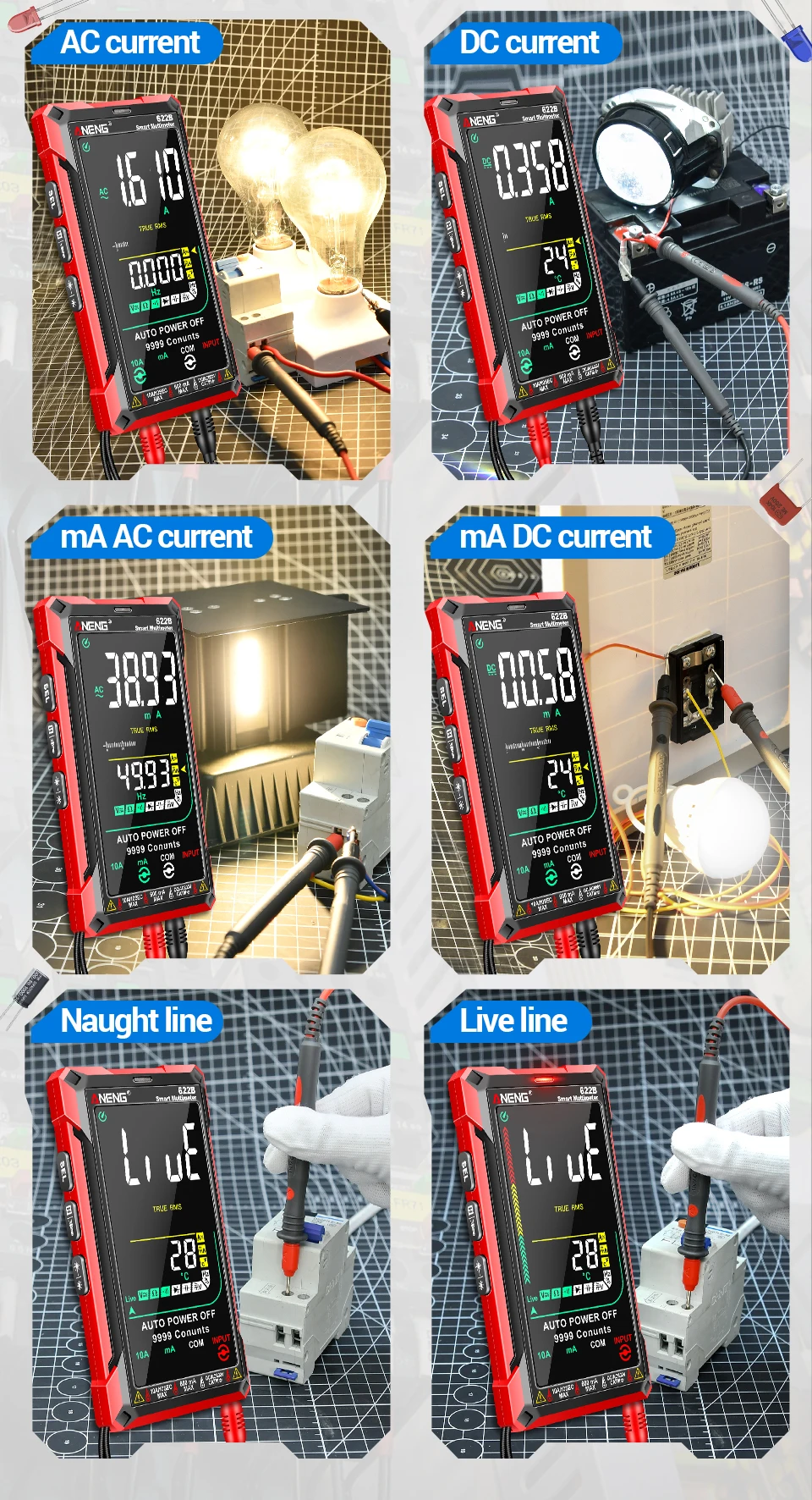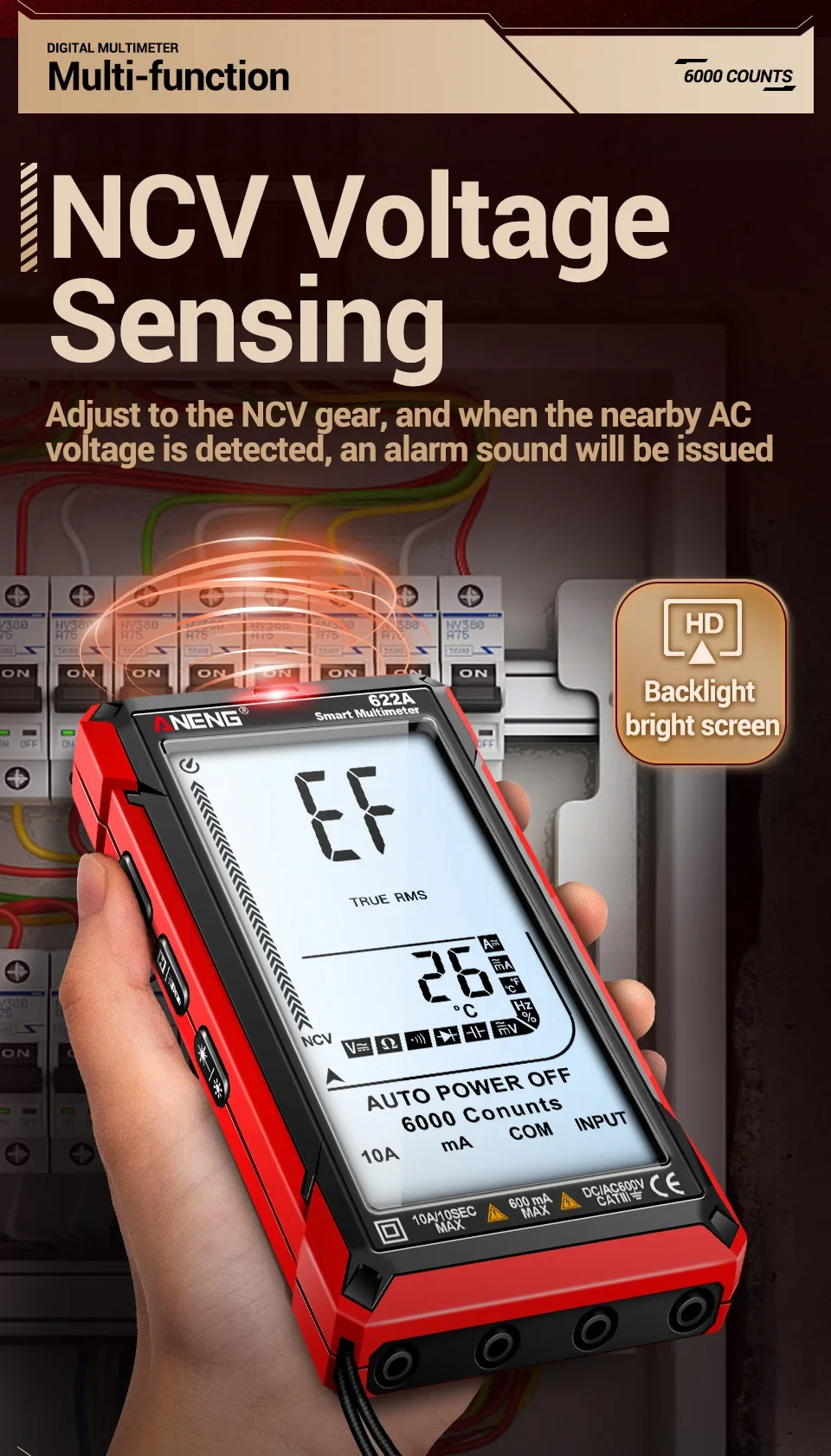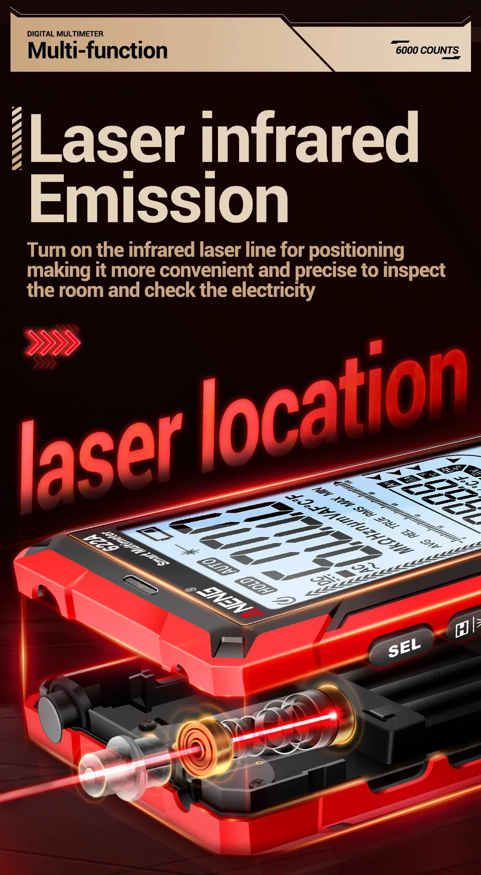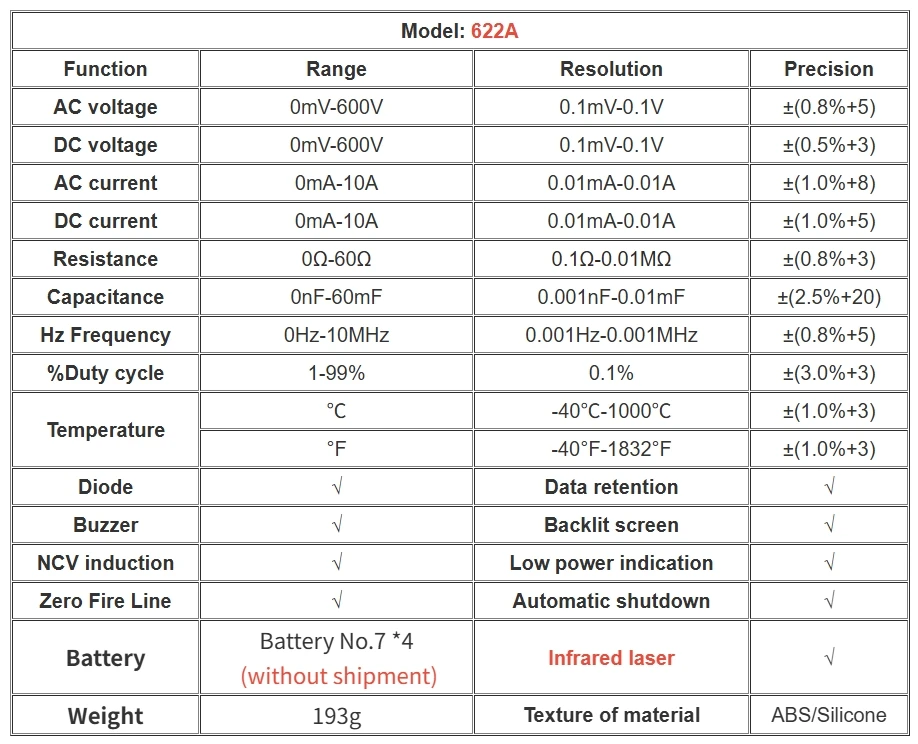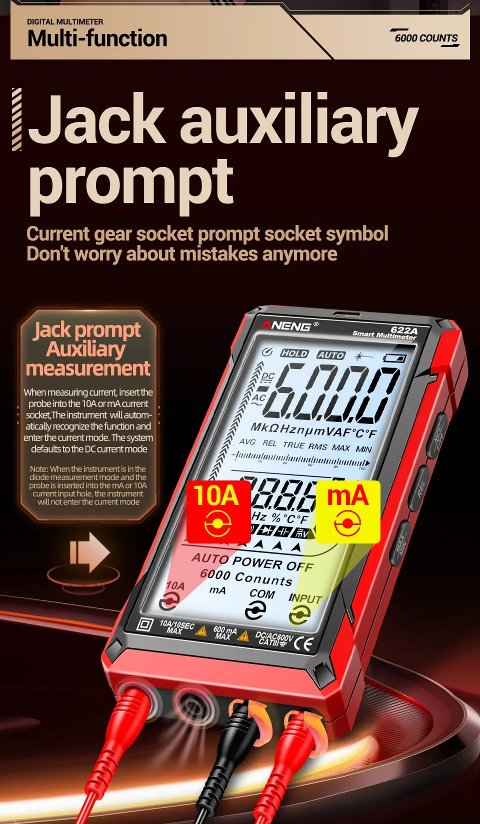 Multímetro ANENG 622A/622B con lámpara láser Medidor probador inteligente 10A Rango automático True RMS Voltaje CC/CA Pantalla analógica Multitester Capacitancia REL Ohm Diodo NCV Hz Herramientas de medida DMM