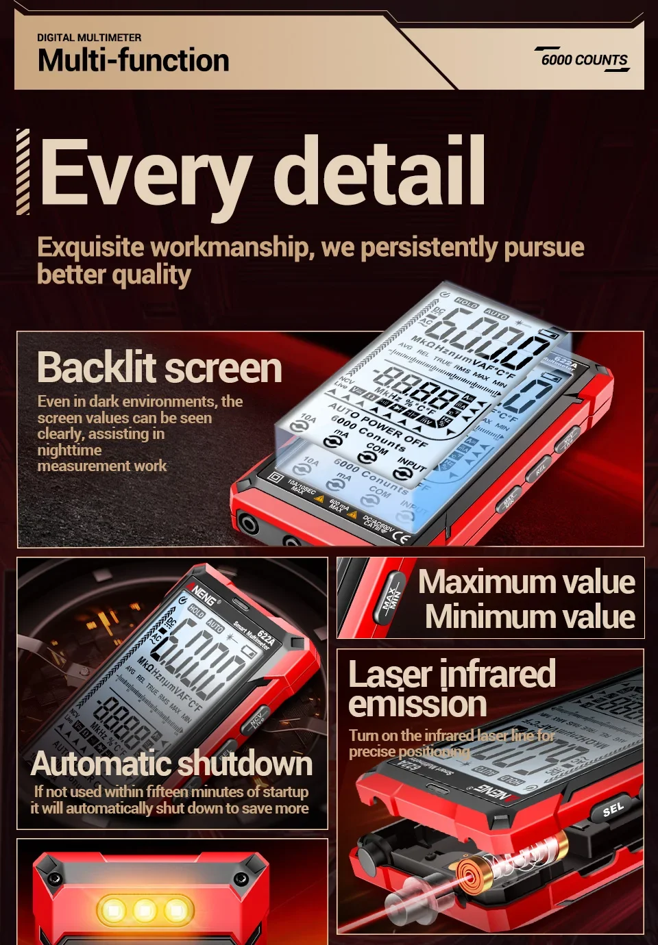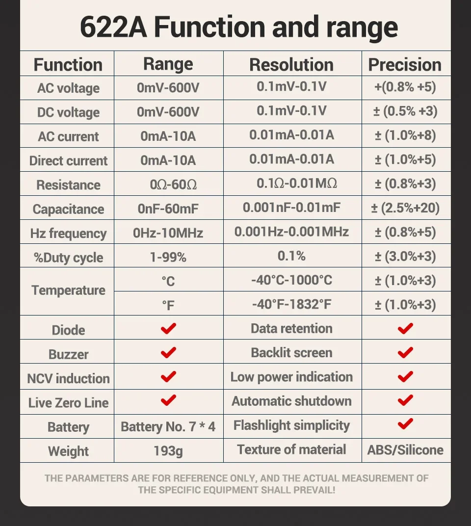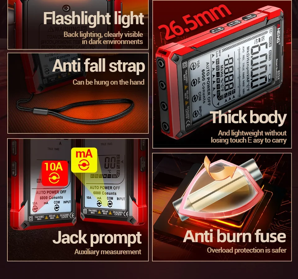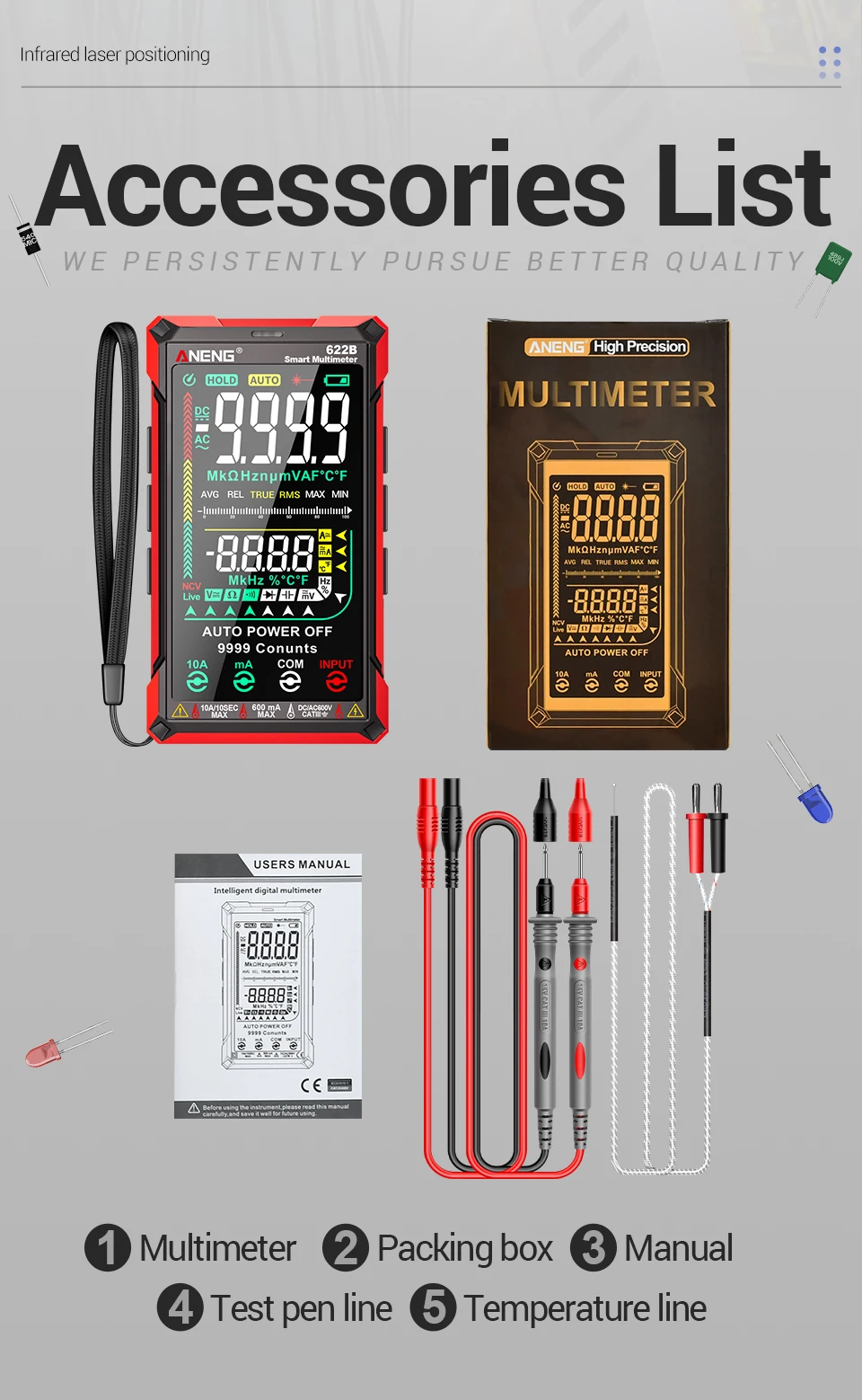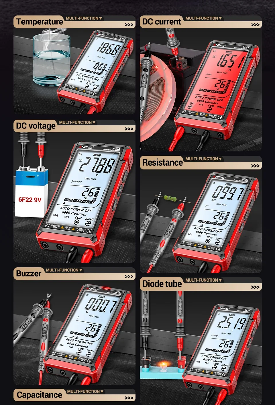 Multímetro ANENG 622A/622B con lámpara láser Medidor probador inteligente 10A Rango automático True RMS Voltaje CC/CA Pantalla analógica Multitester Capacitancia REL Ohm Diodo NCV Hz Herramientas de medida DMM