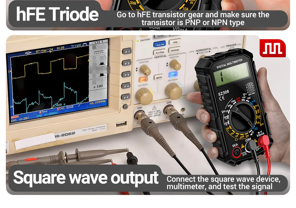 4.Generador de onda cuadrada incorporado y conector de transistor hFE: señal PWM rápida o prueba de triodo sin herramientas adicionales.
