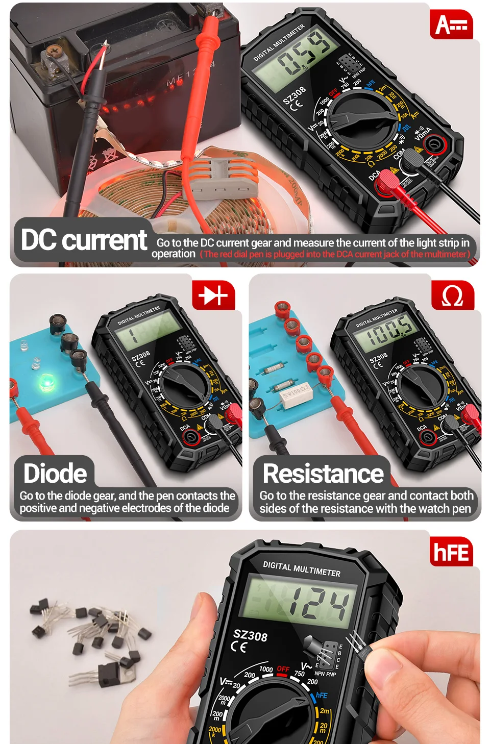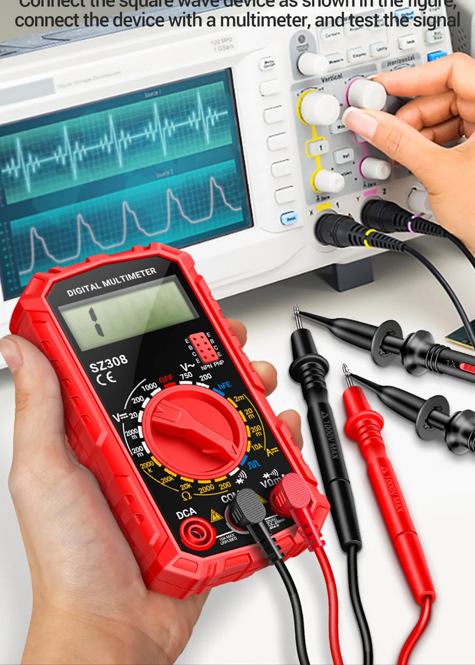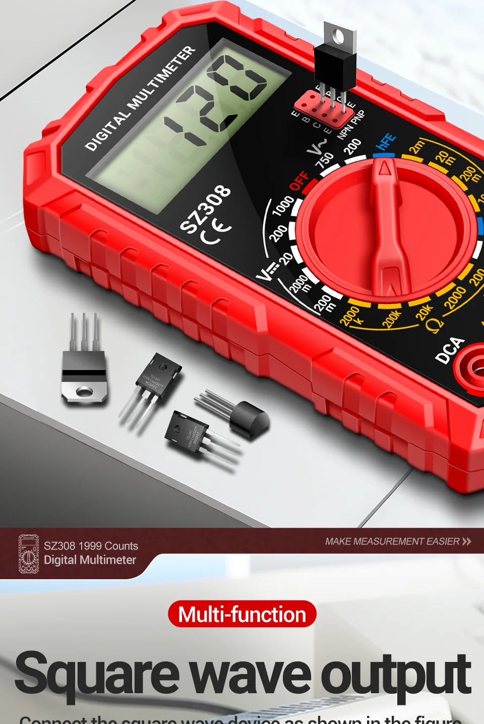 Multímetro Digital 1999 recuentos ANENG SZ308 prueba de onda cuadrada 1000V voltaje CC 10A medidor de corriente CC hFE Triodo herramientas de reparación del hogar