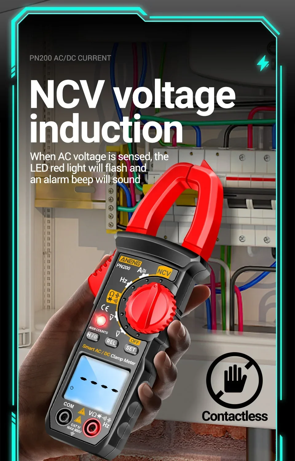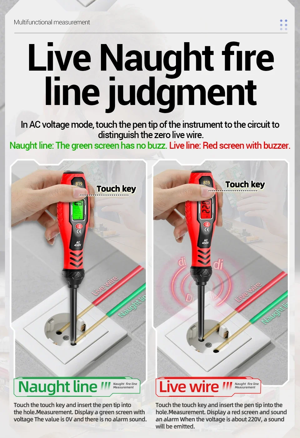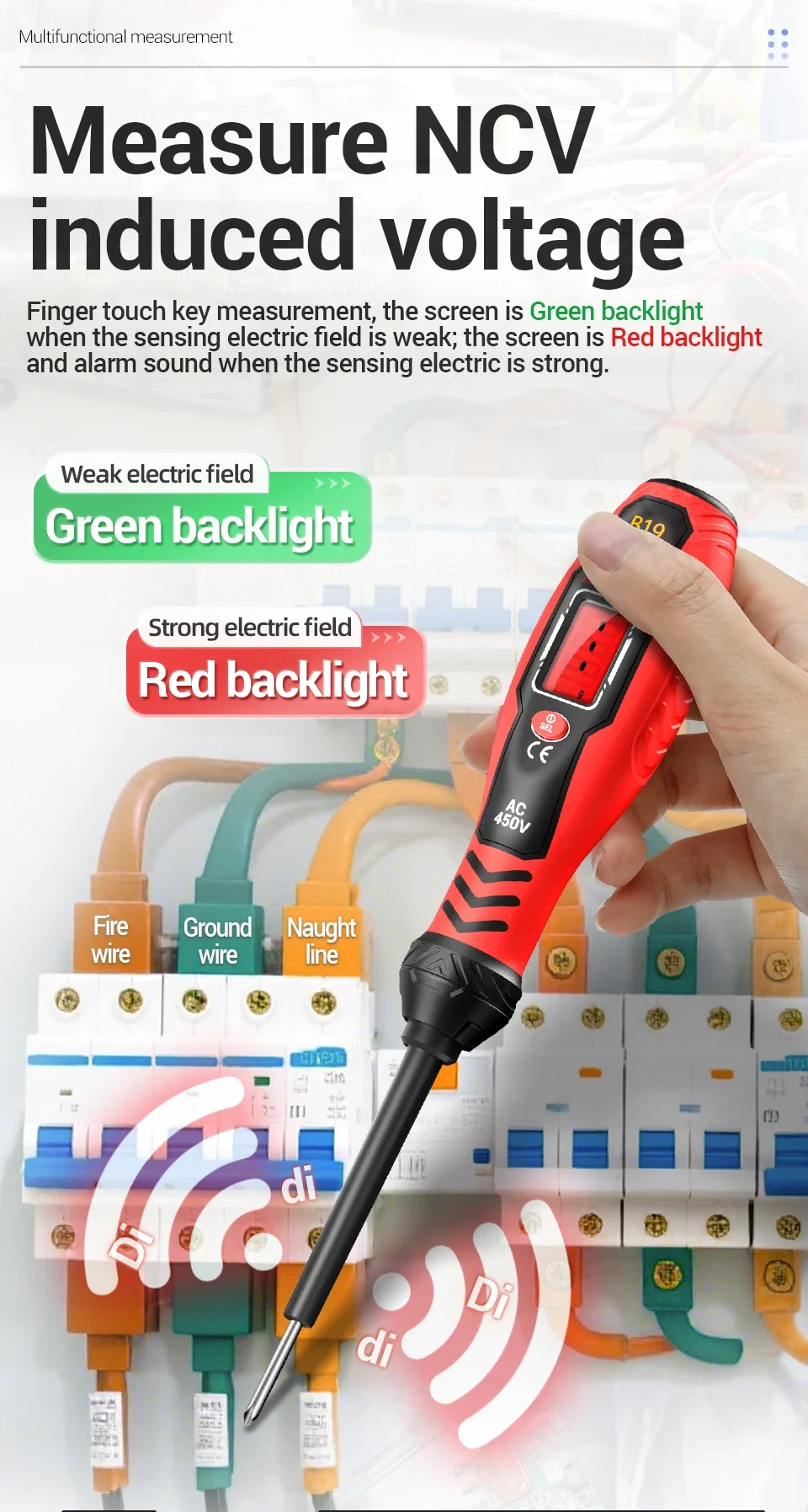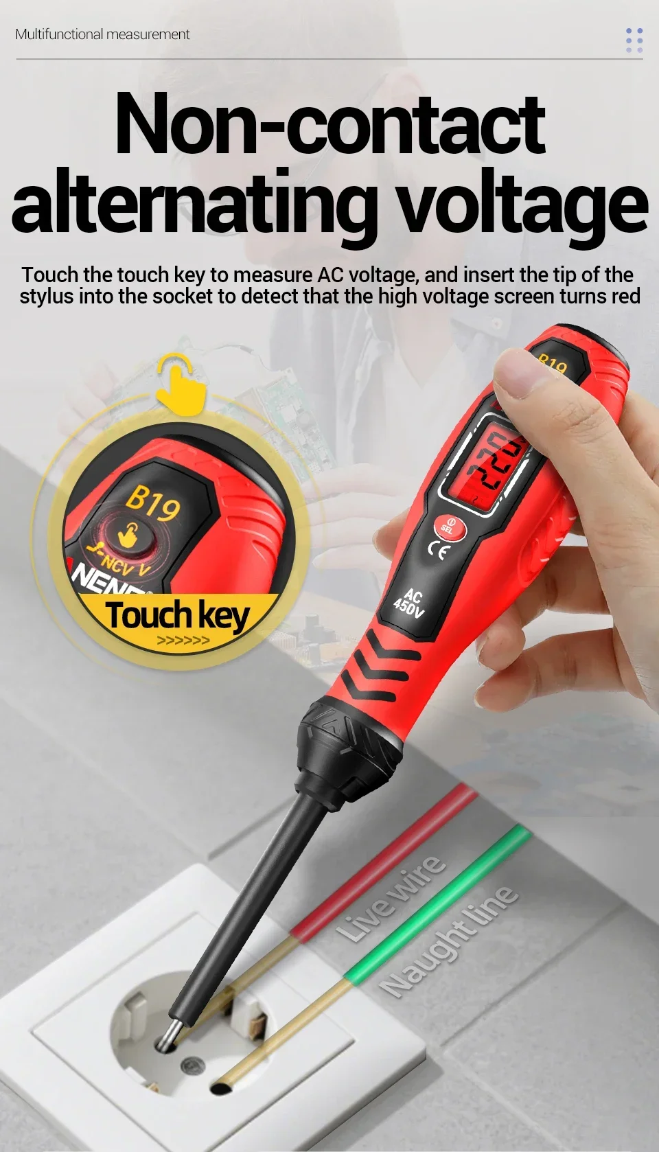 Durante el proceso de prueba, los dedos deben estar en pleno contacto con la pieza del poste táctil. La medición del voltaje de CA debe estar en contacto con un conductor vivo para obtener valores precisos.