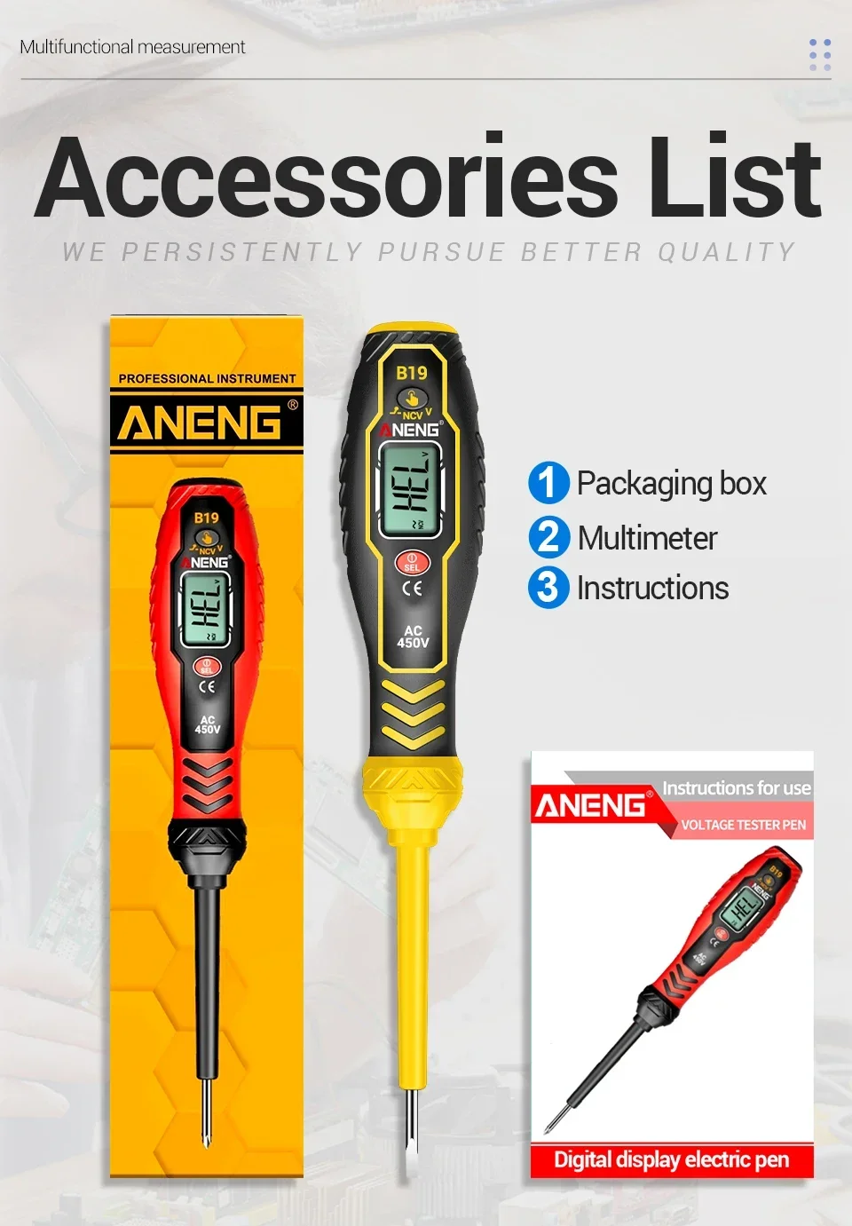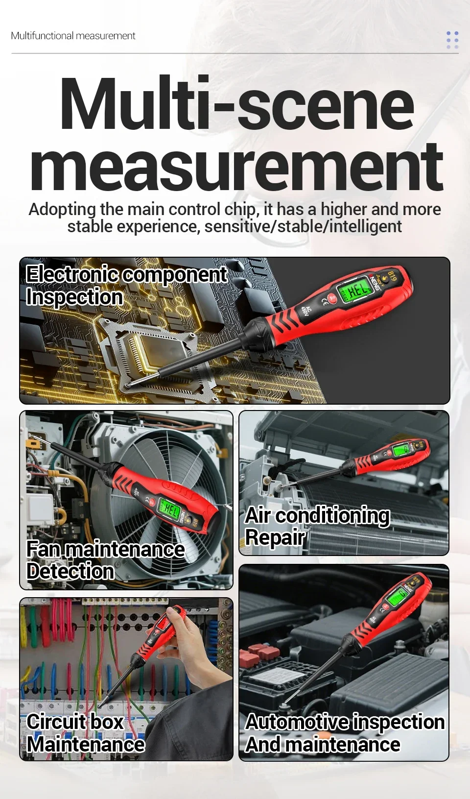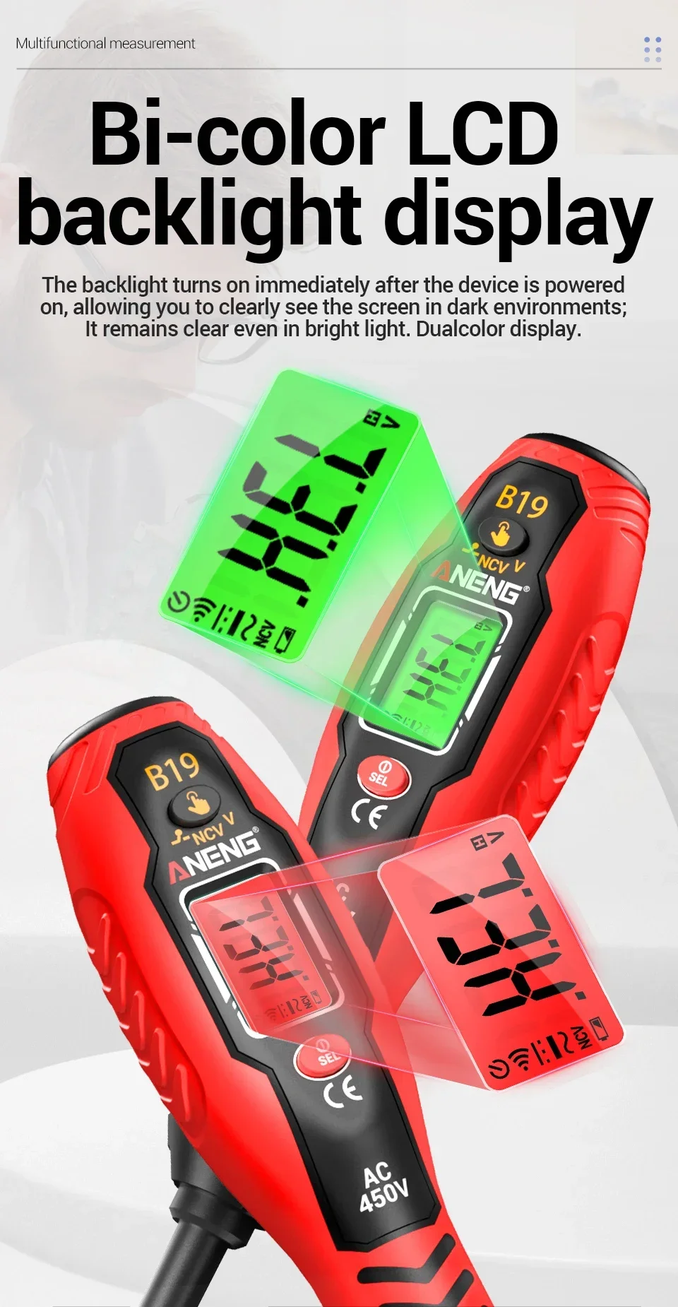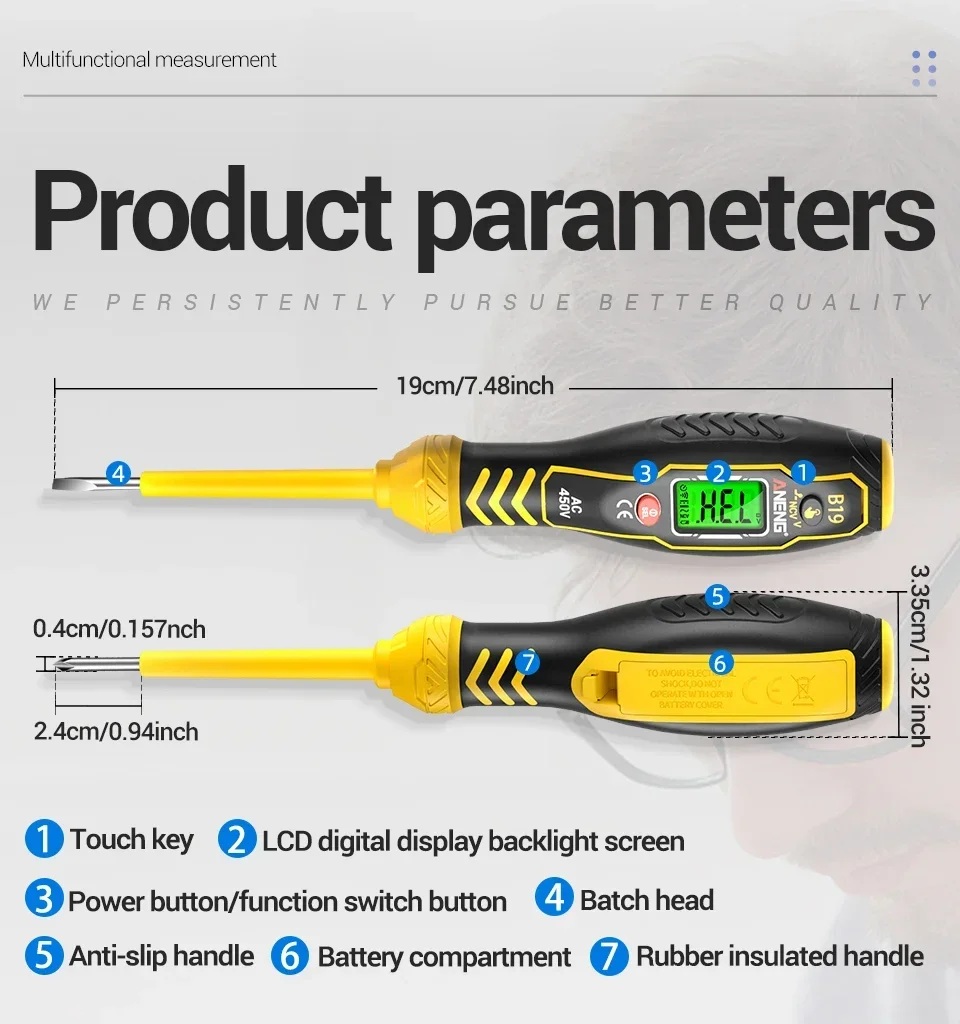 Durante el proceso de prueba, los dedos deben estar en pleno contacto con la pieza del poste táctil. La medición del voltaje de CA debe estar en contacto con un conductor vivo para obtener valores precisos.