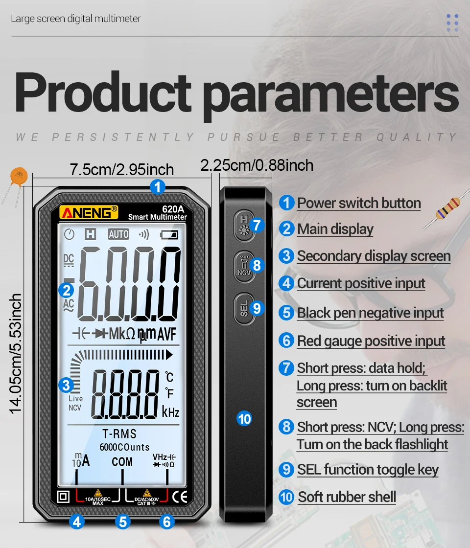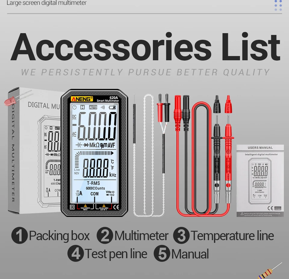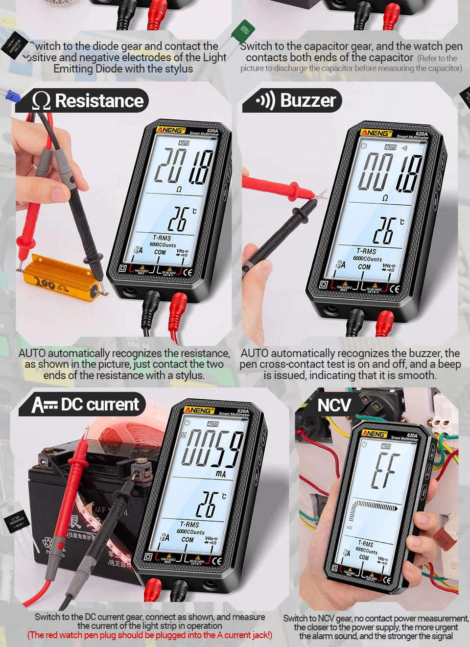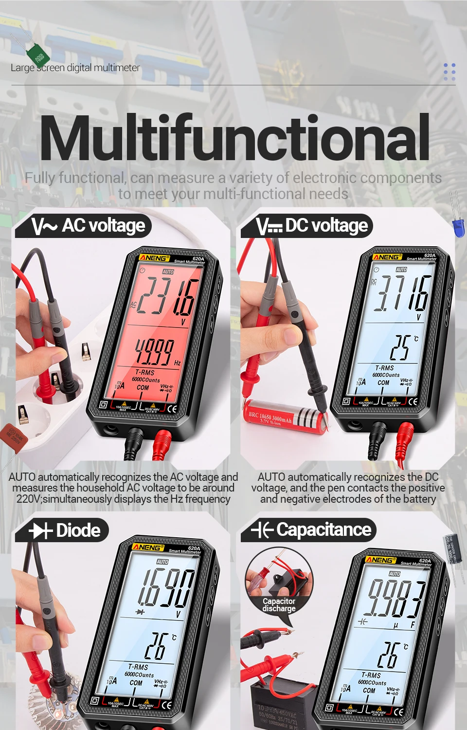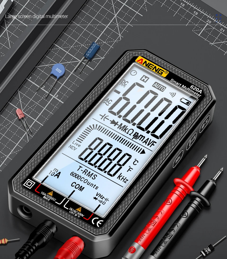 ANENG 620A, multímetro ANENG, multímetro de 6000 recuentos, multímetro digital True RMS, multímetro de rango automático, probador de voltaje NCV, multímetro de mejor presupuesto, herramientas electrónicas de bricolaje, multímetro de reparación de automóviles, multímetro LCD grande, herramienta de electricista doméstico, multímetro de linterna, medidor de capacitancia, Hz Probador de temperatura, alternativa de pinza digital, revisión de multímetro de bolsillo, multímetro para principiantes, multímetro de grado de laboratorio, medidor de prueba de paneles