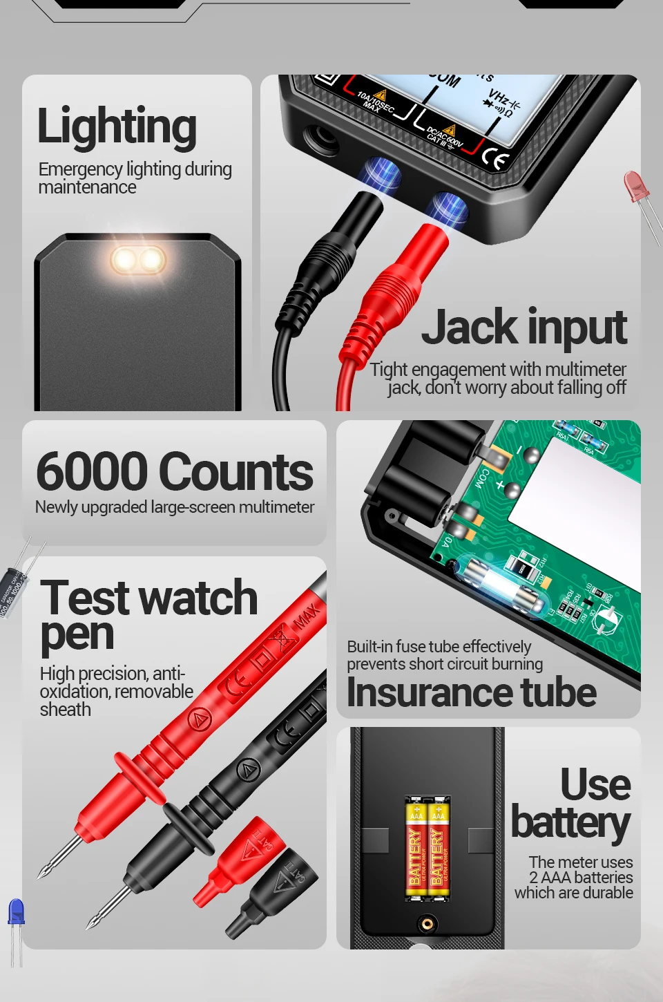 ✔ Seguridad de rango completo: 600V/10A, antiquemaduras inteligente, cubierta de choque de silicona, CAT-III 600V