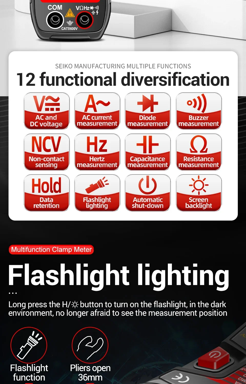 Este producto es un multímetro de pinza digital que funciona con batería y rango automático con un6000 cuentasPantalla LCD y retroiluminación.