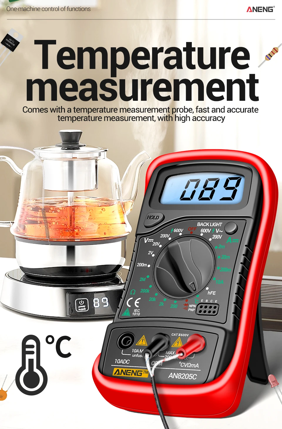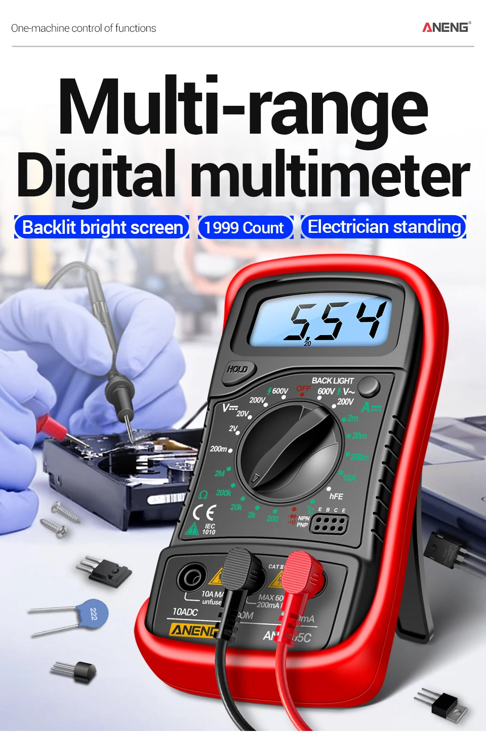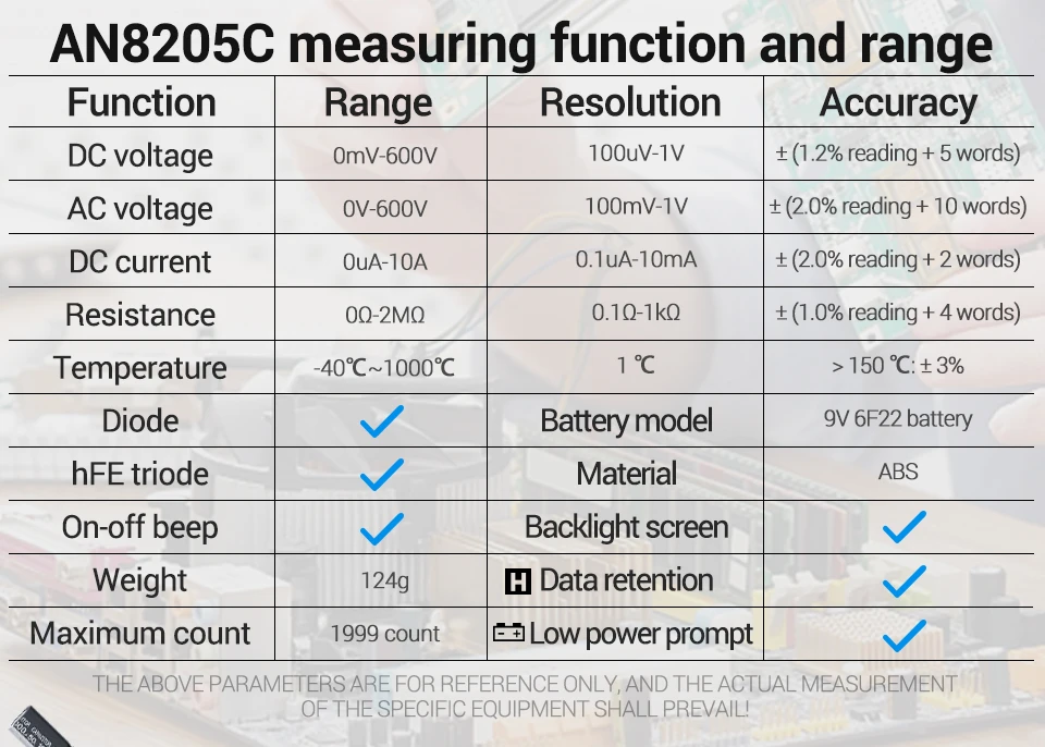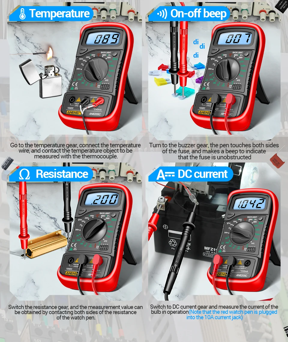 ANENG AN8205CMultímetro digital Medidor de voltaje CA/CC Resistencia de corriente CC -40℃~1000℃ Herramientas de prueba de retroiluminación LCD de diodo de temperatura