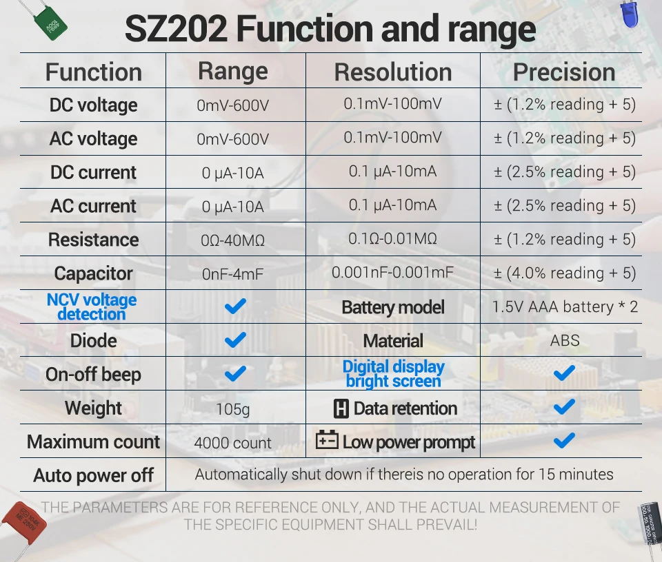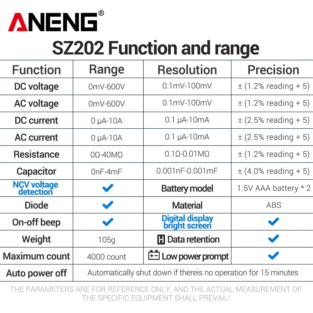 ANENGSZ202Multímetro Digital probador de voltaje CA/CC 4000 cuentas zumbador 10A medidor de corriente CA condensador de resistencia herramienta de prueba NCV