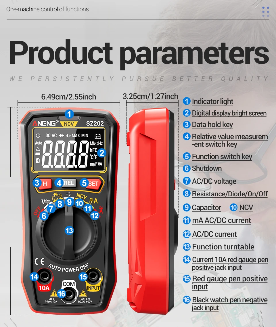 Comprar Multímetro Digital resistente ANENG SZ202 voltaje CA/CC 4000 recuentos zumbador 10A medidor de corriente CA condensador herramienta de prueba NCV