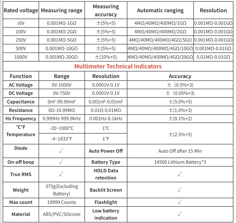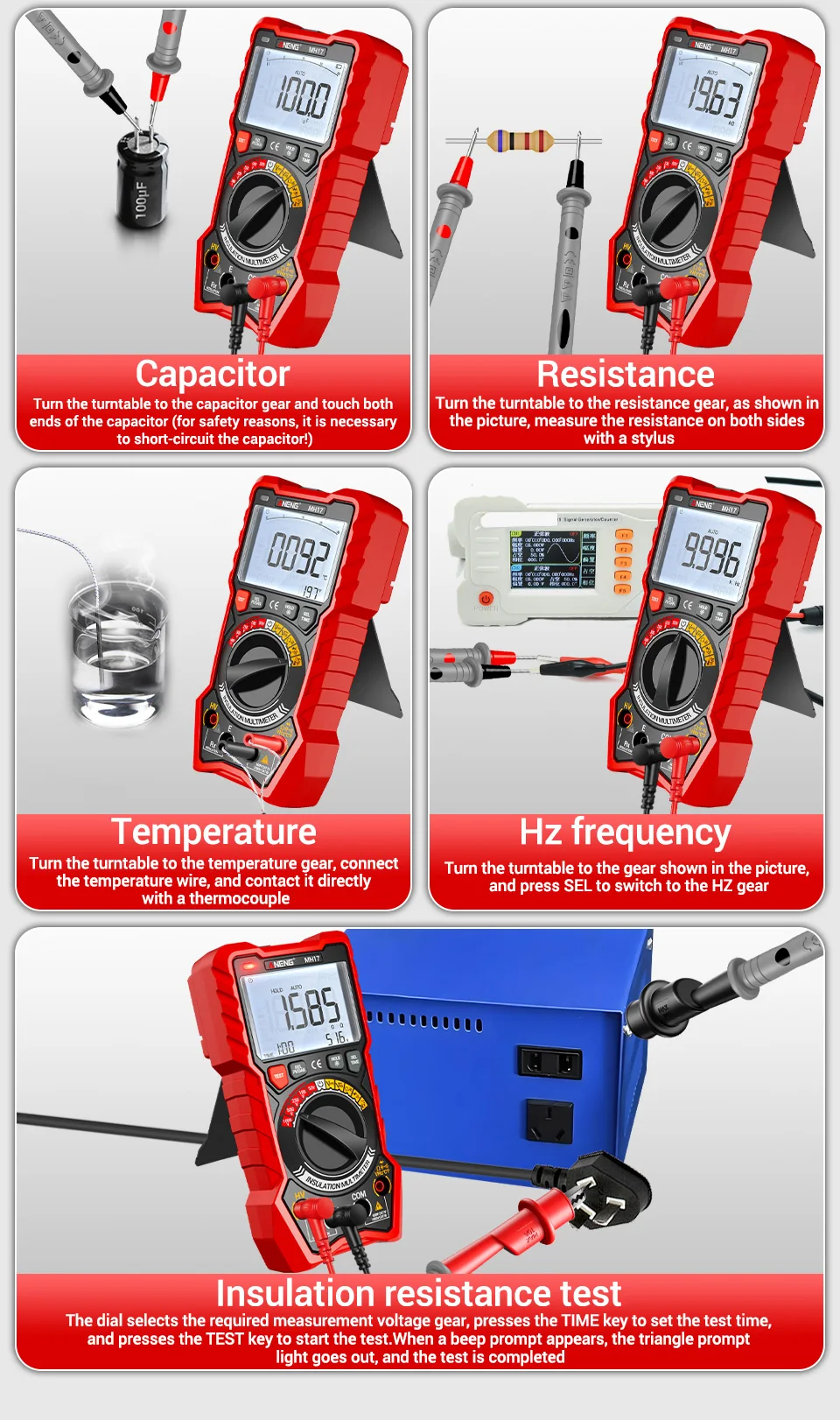 1.Diseño de doble función: combina megóhmetro + multímetro (resistencia, voltaje, capacitancia, etc.).