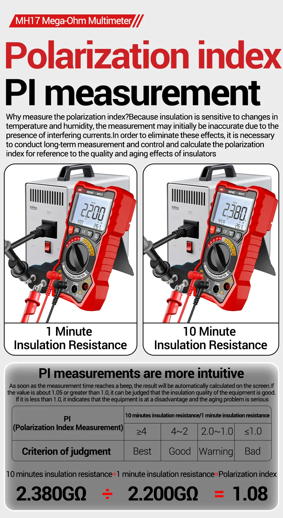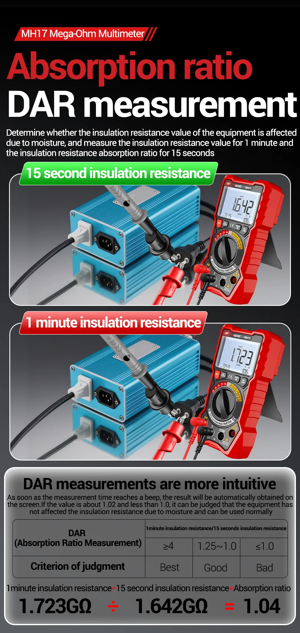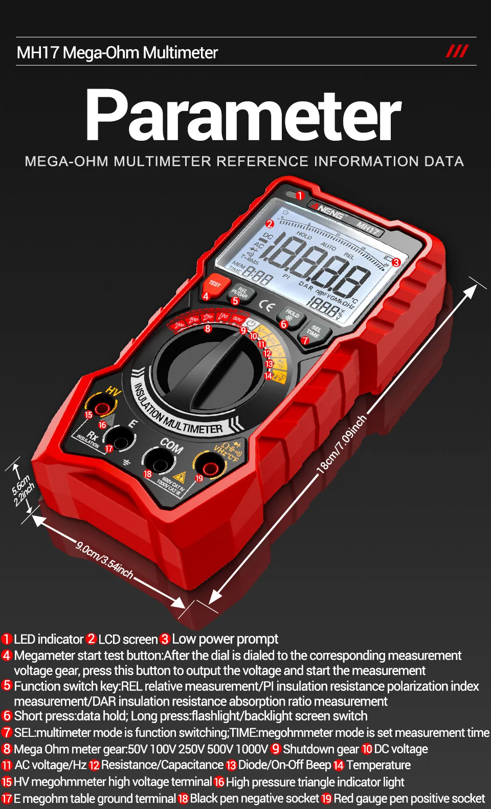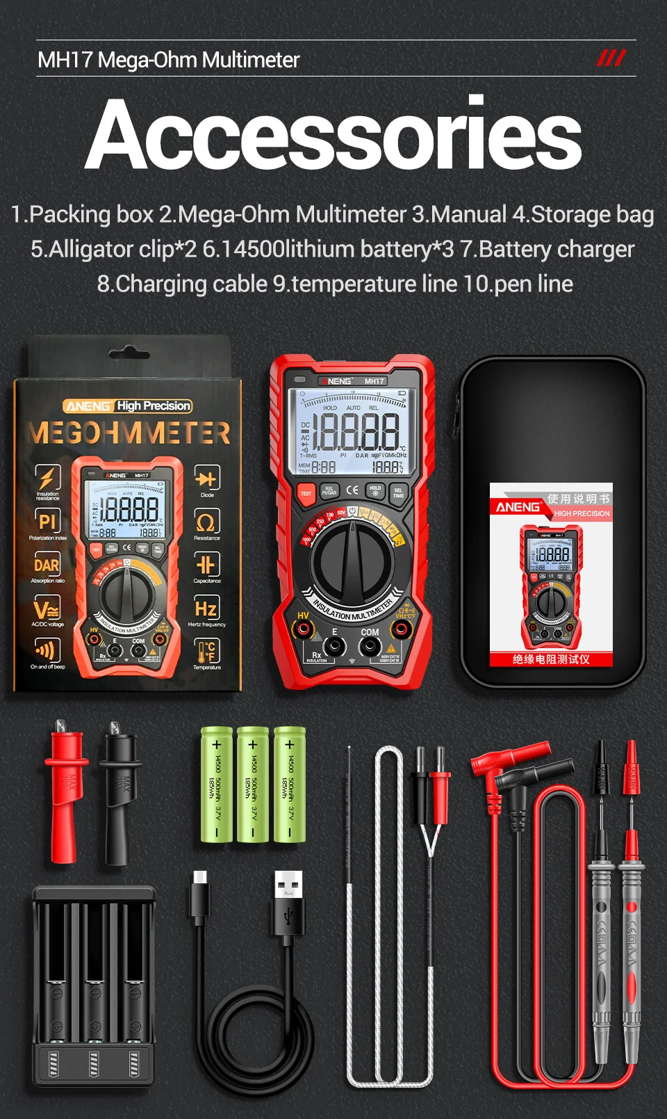megóhmetro AC 1000V, probador de resistencia de aislamiento, 0. 001MΩ-20GΩ, medición PI DAR, ANENG MH17, multímetro True RMS, prueba de aislamiento HVAC, probador de aire acondicionado para automóviles, cinco rangos de voltaje, CAT III 1000V, CAT IV 600V, megador de linterna, probador recargable USB-C, medidor de relación de absorción, herramienta de índice de polarización, instrumento de seguridad para electricistas, probador de aislamiento manual, megger de bricolaje, megohmmetro de depuración de campo, prueba de resistencia deComprar Multímetro de resistencia de aislamiento 2 en 1 ANENG 19999 MH17 medidor de voltaje CA/CC batería de litio megóhmetro PI/DAR herramientas de reparación de automóviles