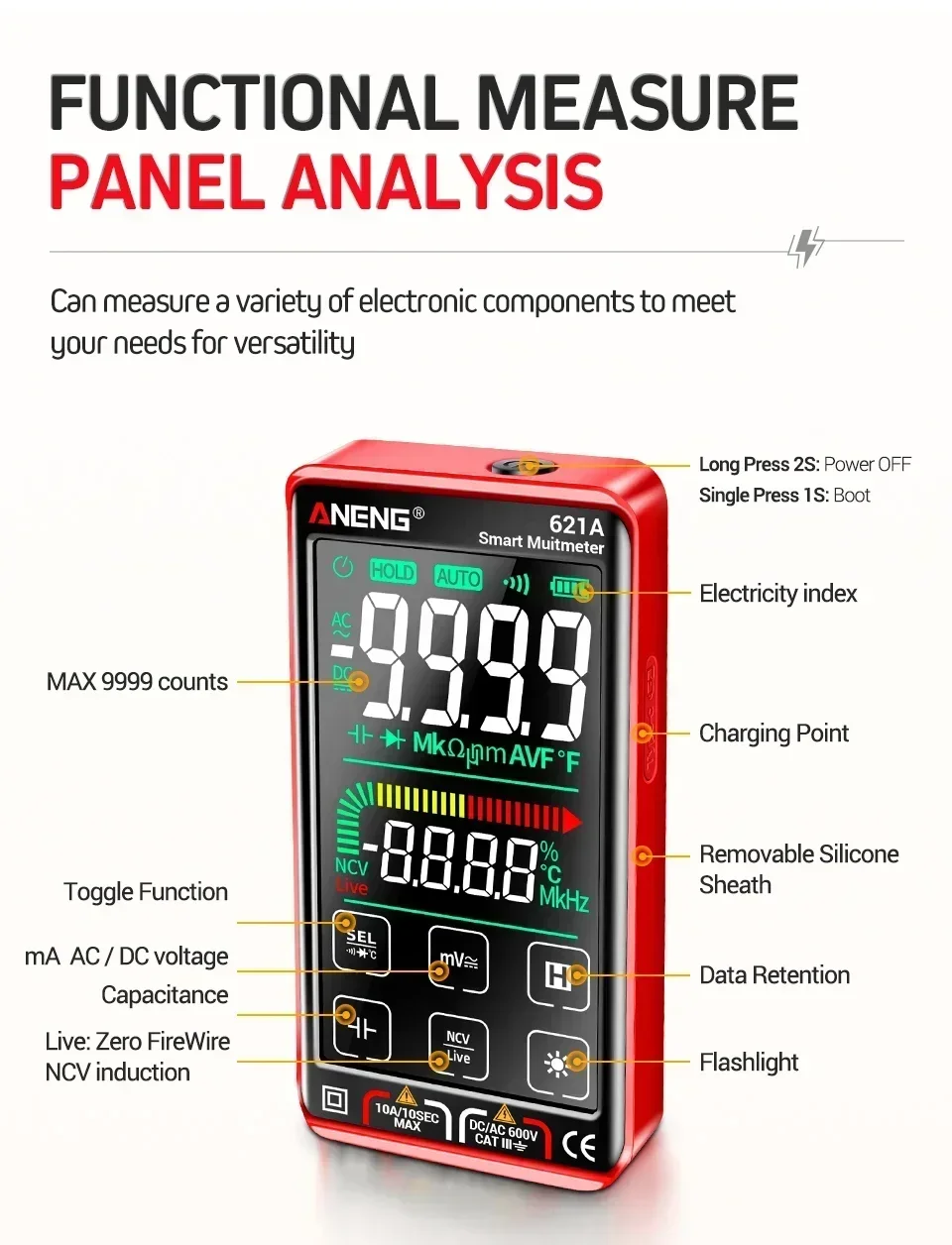 999,9Ω/9,999kΩ/99,99kΩ/999,9kΩ/9,999MΩ/99,99MΩ