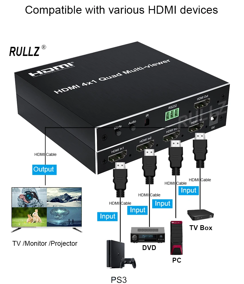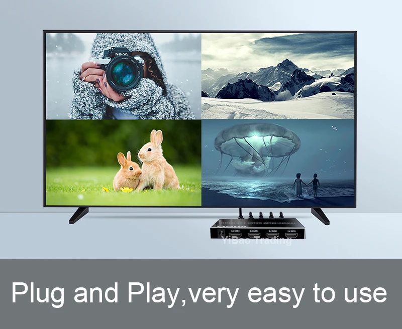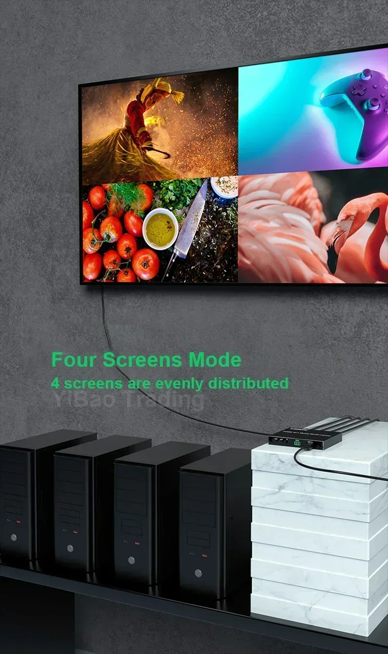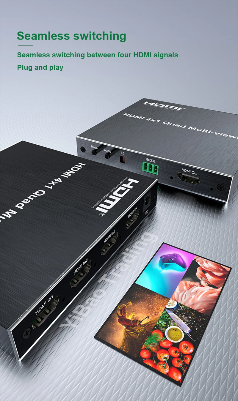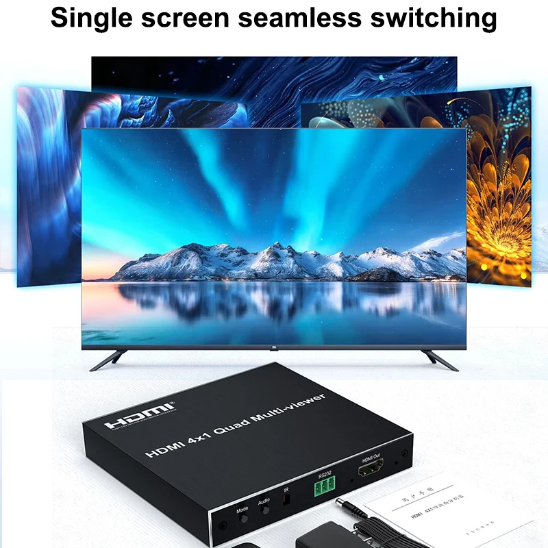 Este multivisor cuádruple HDMI 4x1 es un alto rendimiento con cuatro segmentaciones de pantalla HD y conmutador de función de conmutación sin interrupciones. Puede mostrar señales de video digital HD de 4 canales en la misma pantalla y tiene una variedad de segmentación de video, conmutación continua de 4 señales de entrada HD sincrónicamente. Los métodos de control del interruptor son flexibles,