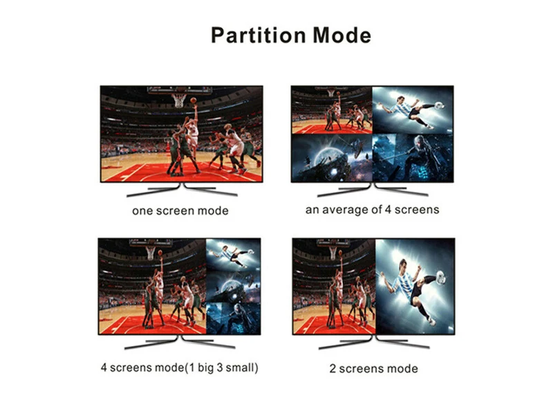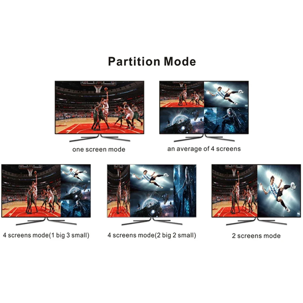 Puede mostrar la señal de vídeo digital 4HD en la misma pantalla y tiene 5 tipos de modos de visualización, conmutación sin interrupciones 4 señal de entrada HD sincrónica.
