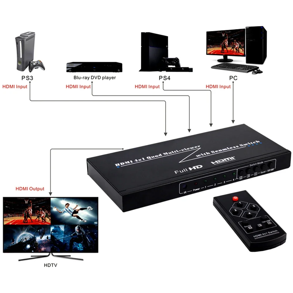 HDMI 4x1 Quad Multi-VIEWER es un alto rendimiento con cuatro segmentación de pantalla HD y conmutación sin problemasInterruptor de salida. Alta calidad, ¡Compre con confianza!