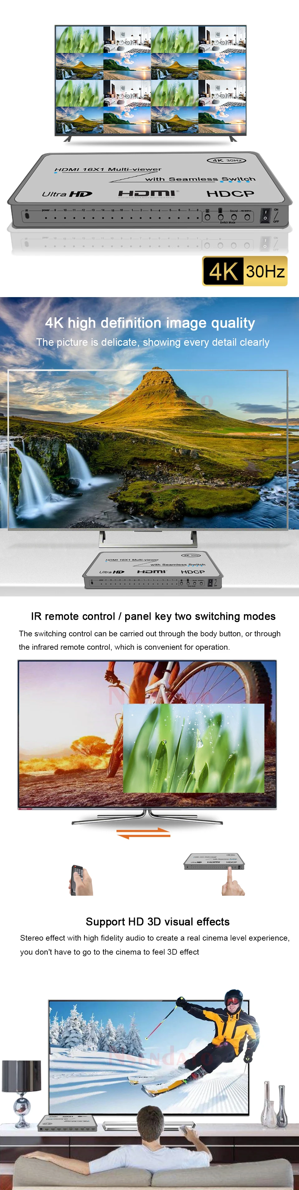 Este producto es un visor múltiple de alto rendimiento 16 por 1 con interruptor continuo. Admite 16 fuentes de entradas de alta definición que se muestran en una pantalla y tiene tres modos de efecto multivista. Como conmutador, también puede cambiar sin problemas las 16 entradas HD libremente. El producto se puede controlar mediante el botón frontal o el controlador IR.