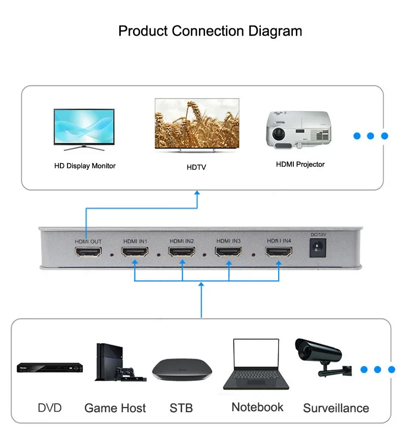 Interruptor de salida de conmutación. Puede mostrar la señal de vídeo digital 4HD en la misma pantalla, y tiene una variedad de segmentación de vídeo, conmutación sin interrupciones de la señal de entrada 4 HD sincrónicamente. Los métodos de control del interruptor son flexibles,