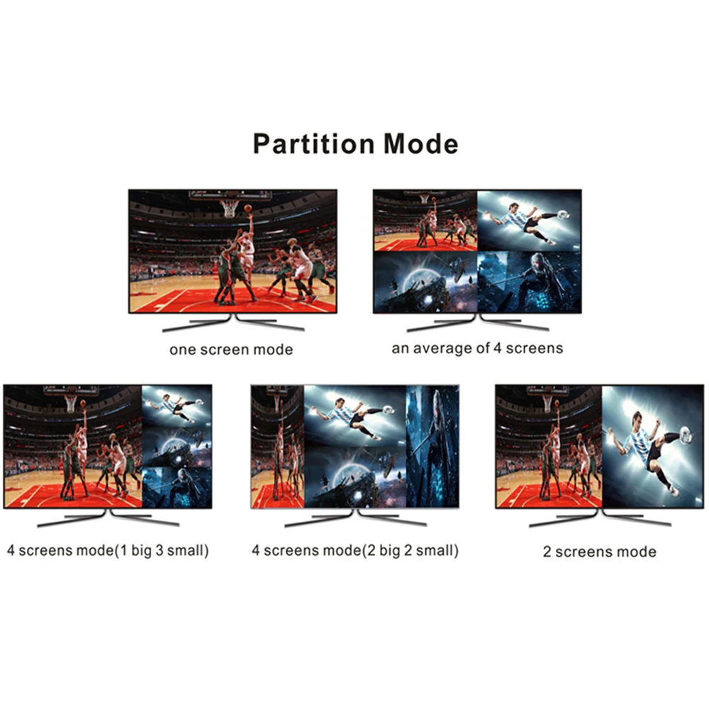 switching output switch. It can display 4HD digital video signal on the same screen, and has a variety of video segmentation, seamless switching 4 HD input signal synchronously. The control methods of the switch is flexible,