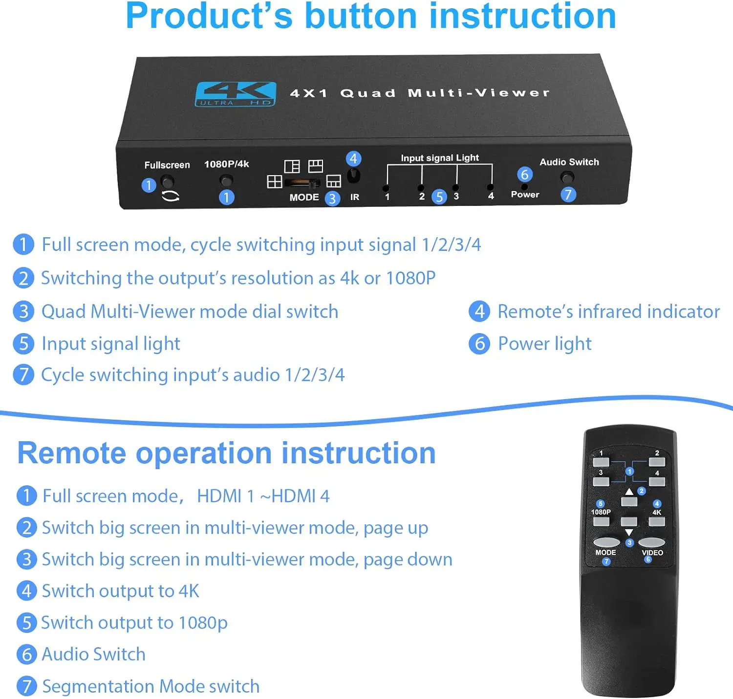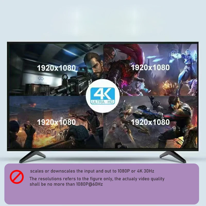 El visor cuádruple HDMI 4 en 1 admite la función de escalador y puede admitir resoluciones de entrada y salida de hasta 3840X2160 @ 30Hz y HDCP 1,4. Puede escalar la señal de entrada 1080P a 3840X2160 @ 30Hz.(Nota: las resoluciones se refieren solo a la figura, la calidad real no es más de 1080P)