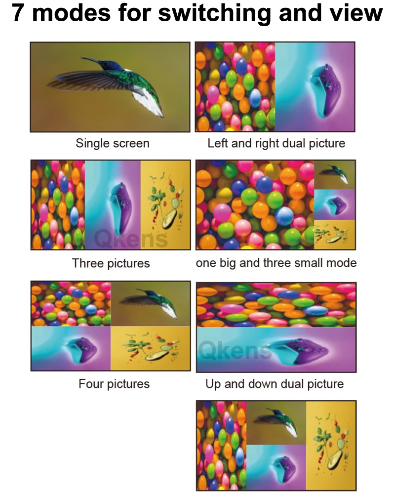 Interruptor de salida de conmutación. Puede mostrar la señal de vídeo digital 4HD en la misma pantalla, y tiene una variedad de segmentación de vídeo, conmutación sin interrupciones de la señal de entrada 4 HD sincrónicamente. Los métodos de control del interruptor son flexibles,