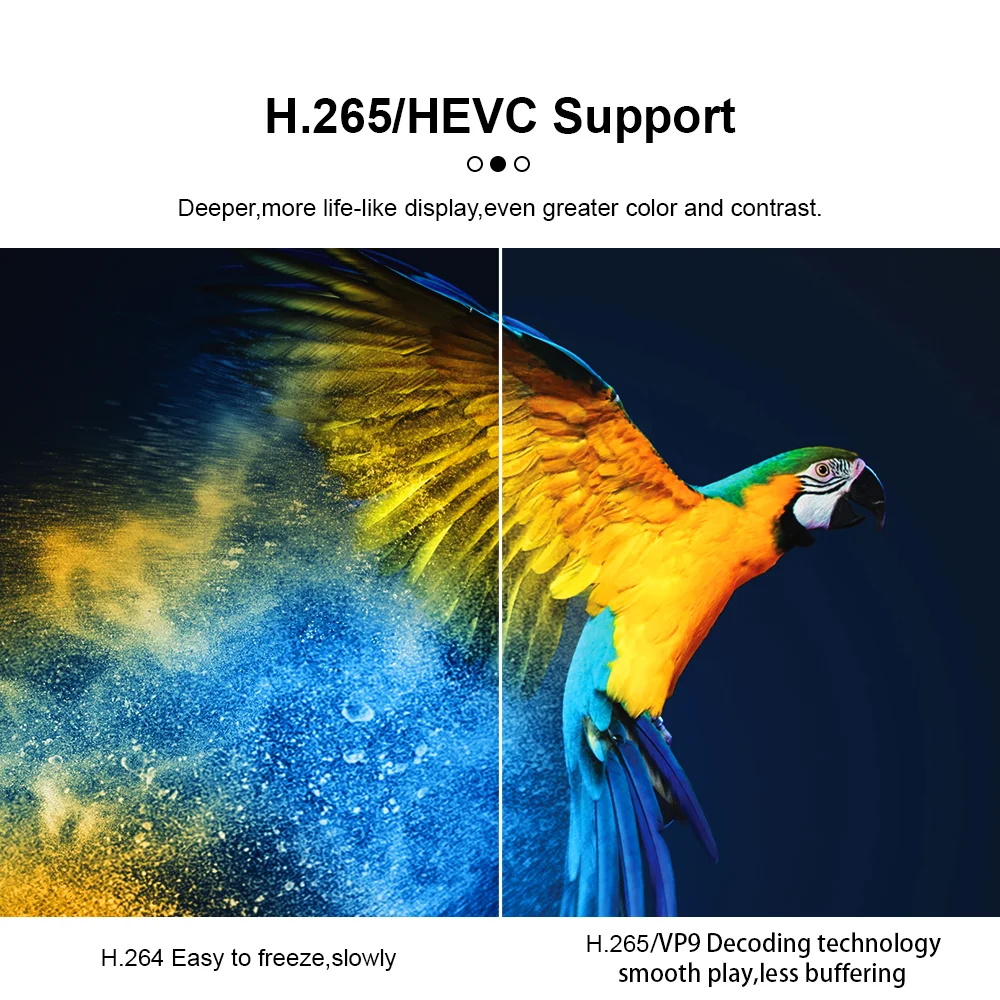 CPU: ARM Cortex A53 de cuatro núcleos; GPU: Mali G31; OS: Android 10, DDR3 1 GB, eMMC 8 GB; Soporte: 4K@30 fps, HDR10+, H.265; Wifi de 2,4 G Hz; 4K Ultra HD