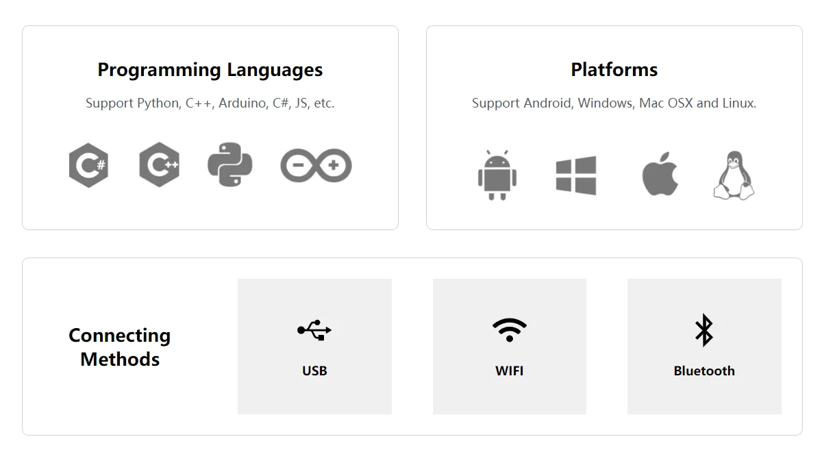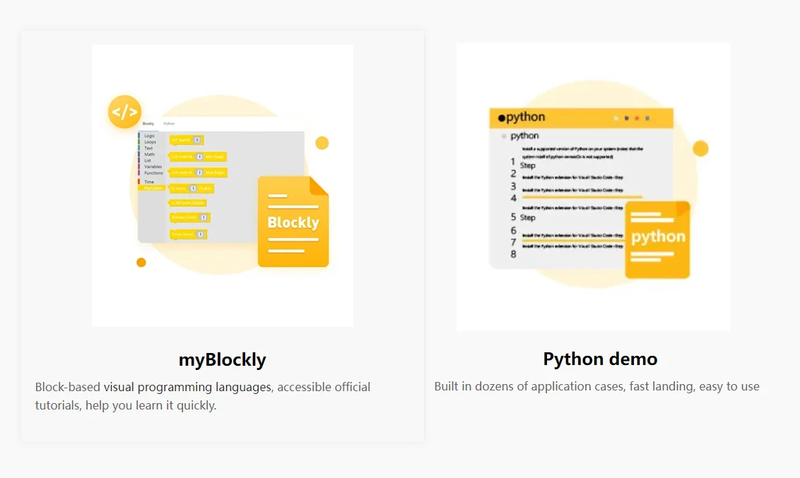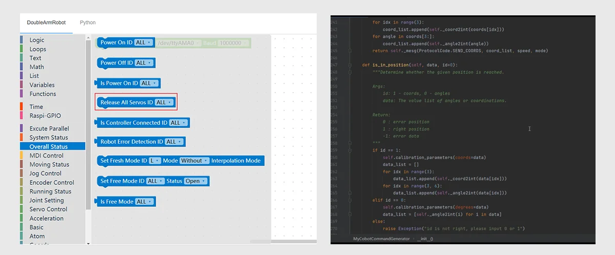 De hele machine motion control drive library van myBuddy is open, meer dan 100 besturingsinterfaces zoals joint angel control, coördinaat control, enz.Daarom kunnen gebruikers algoritmeonderzoek voor het plannen van robotbewegingspad, algoritmeonderzoek voor het vermijden van interferentie met twee armen, het leren van robotvisie en de ontwikkeling van andere toepassingen voor kunstmatige intelligentie realiseren.myBuddy helpt ontwikkelaars en studenten effectief hun persoonlijke wetenschappelijke onderzoeksvermogen te verbeteren.
