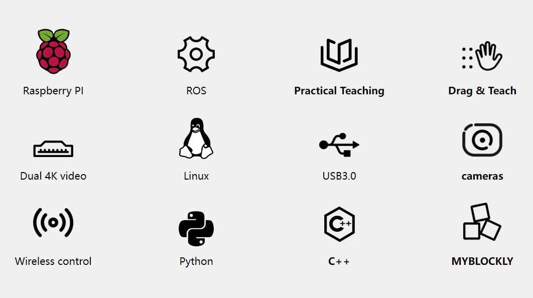 De ROS-ontwikkelomgeving die in het robotsysteem is ingebouwd, biedt een verscheidenheid aan gevallen in de RVIZ en MOVEIT, zoals mobiel volgen, schuifregeling, padplanning en andere geavanceerde toepassingen.De URDF-configuratiedocumenten van de robot zijn open, zodat gebruikers secundaire modificatie kunnen ontwikkelen.