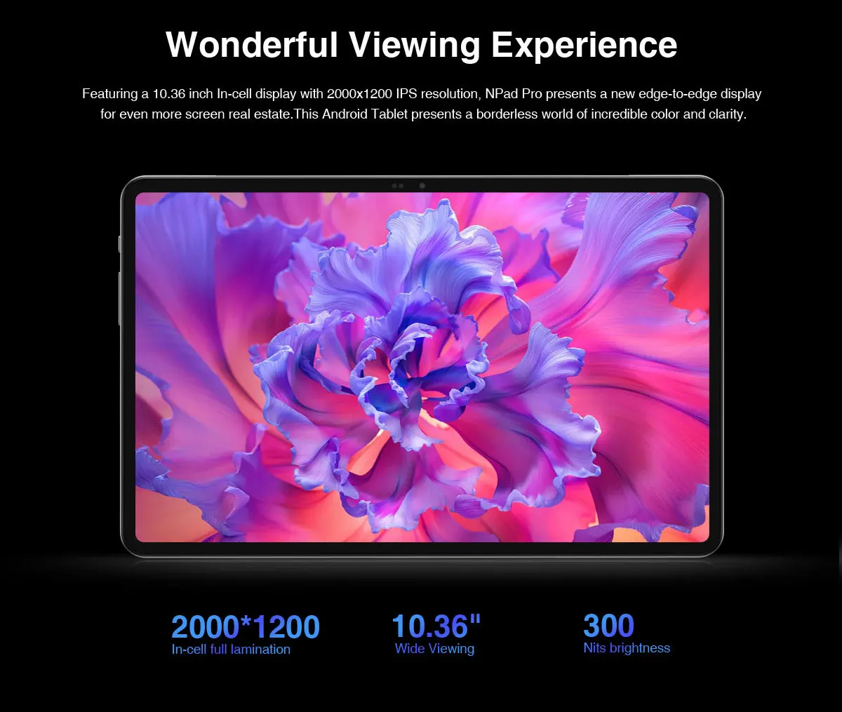 Featuring a 10.36 inch In-cell display with 2000x1200 IPS resolution, NPad Pro presents a new edge-to-edge display for even more screen real estate.This Android Tablet presents a borderless world of incredible color and clarity.