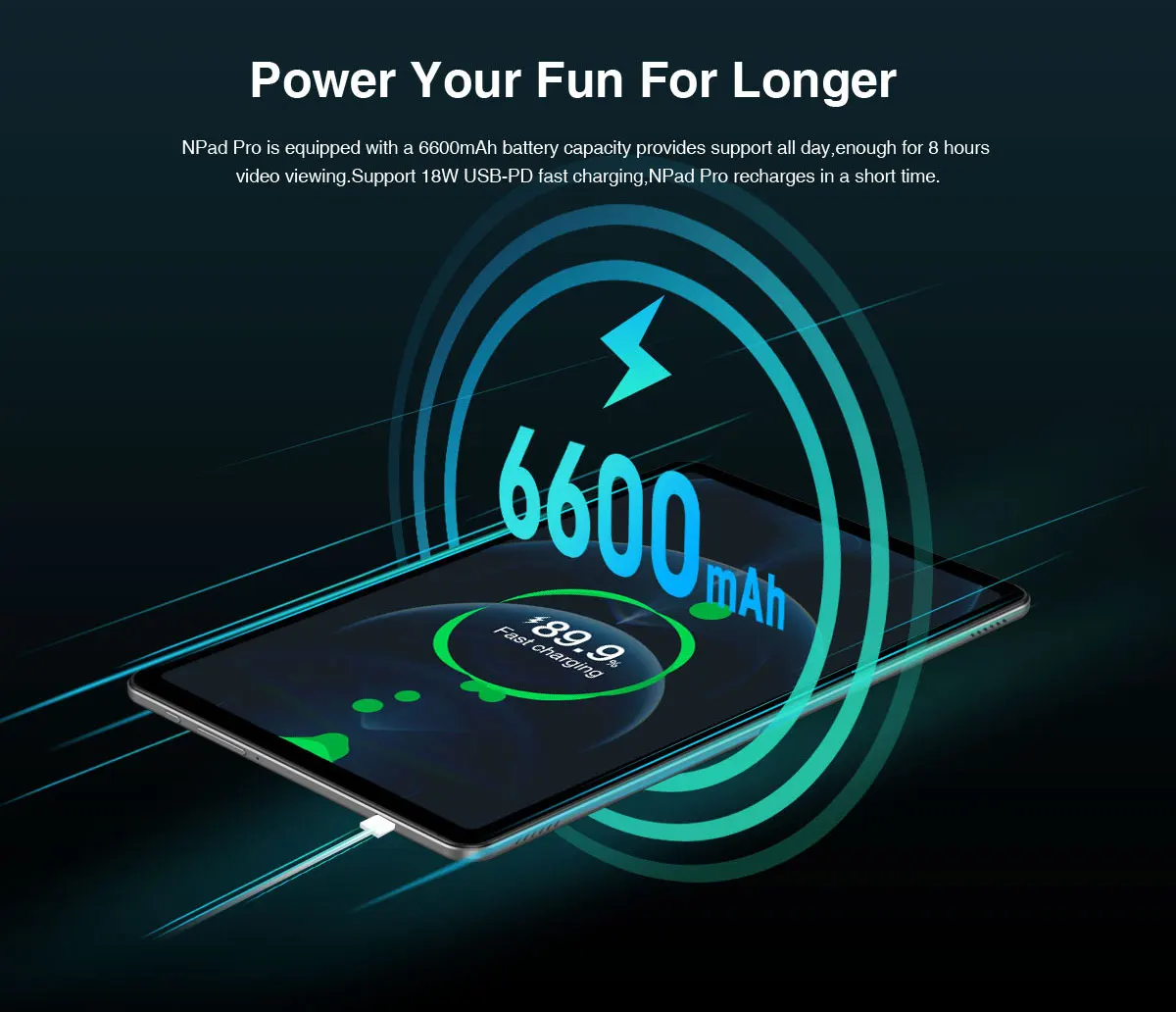 NPad Pro is equipped with a 6600mAh battery capacity provides support all day,enough for 8 hours video viewing.Support 18W USB-PD fast charging,NPad Pro recharges in a short time.