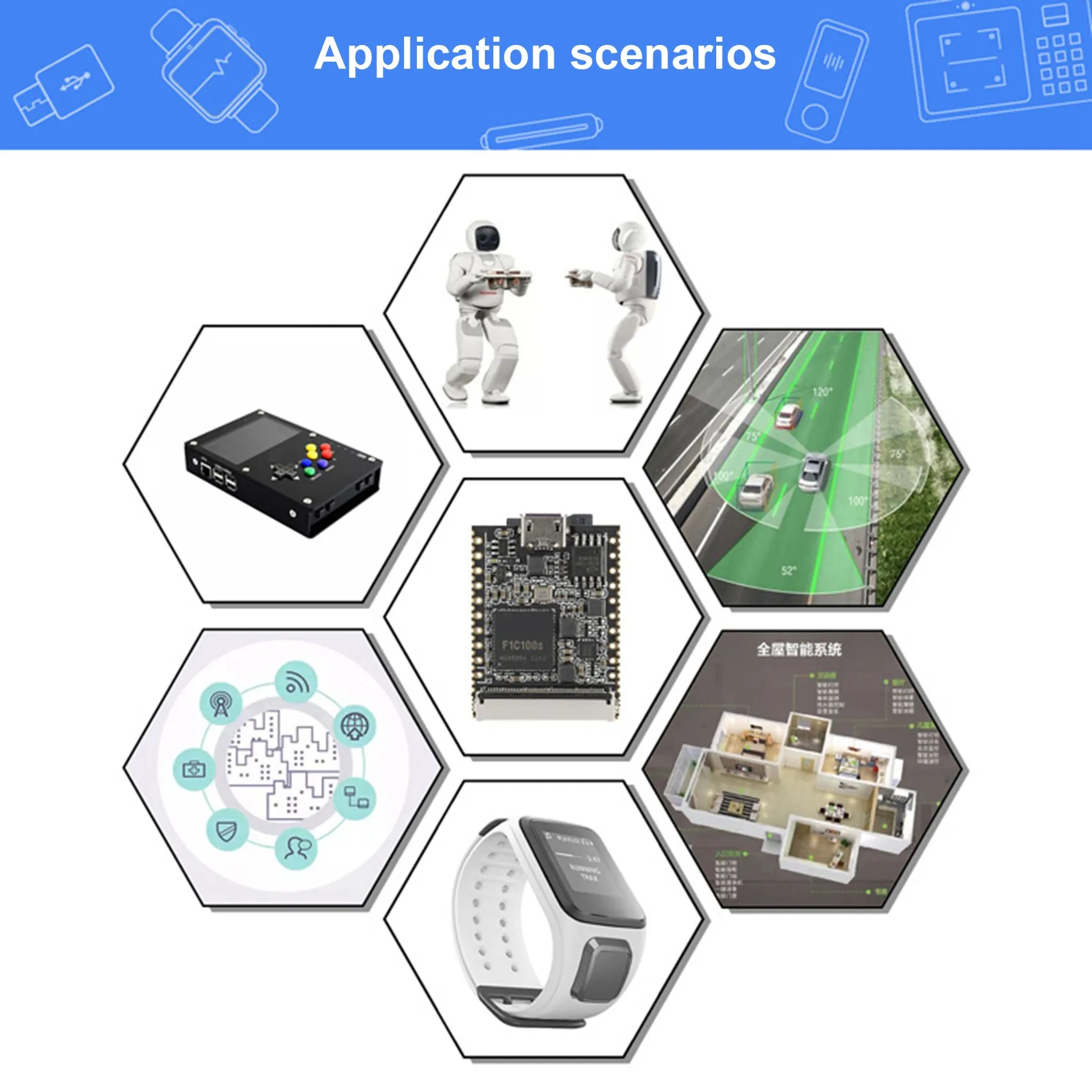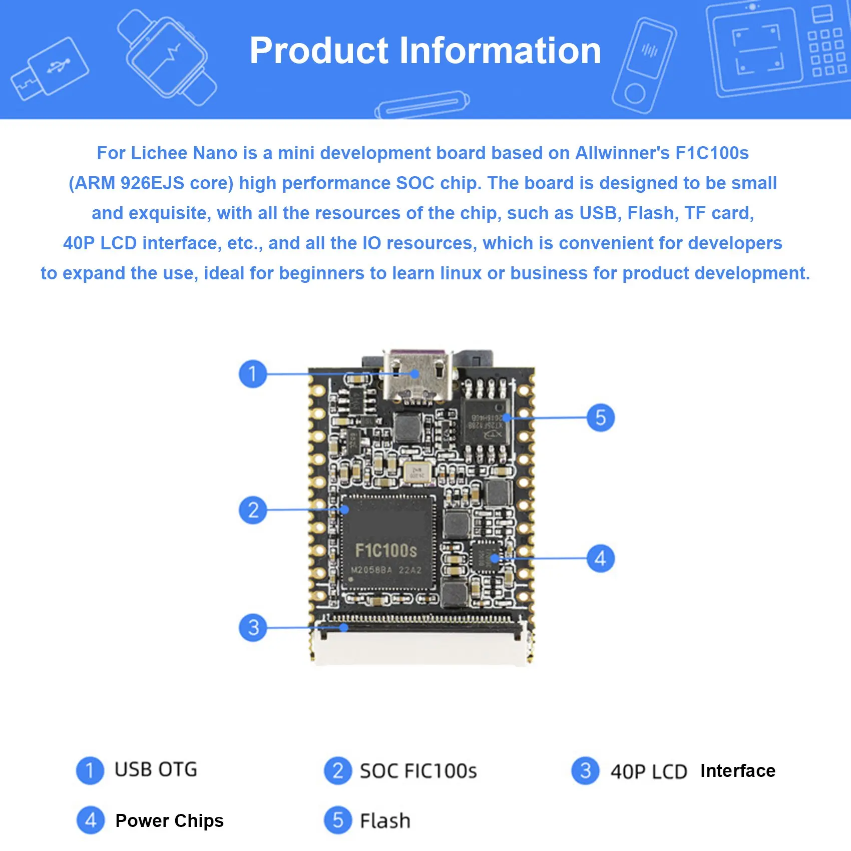 3. Para la placa de desarrollo Nano, el chip F1C100s integrado es potente, el chip tiene 32MB DDR, SDIO, SPI, UART, altavoz, micrófono y otras interfaces,. y soporta externo 8 ~ 32MB SPI ni Flash
