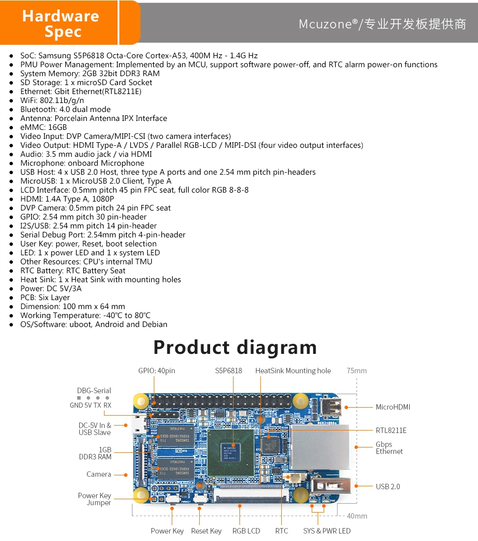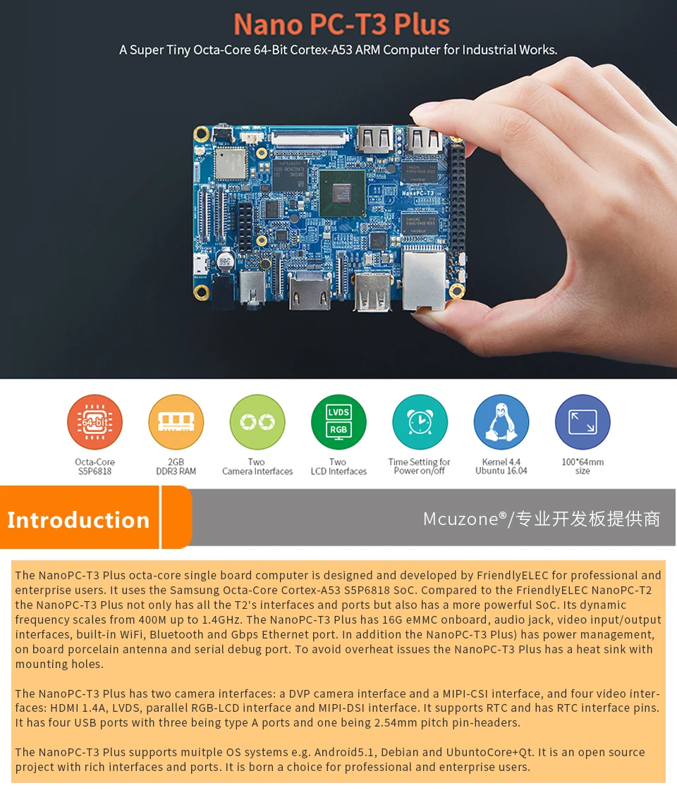 NanoPC T3 Plus,Placa RealQvol FriendlyELEC octa-core S5P6818, puerto Gigabit Ethernet, 16GB eMMC, WiFi Bluetooth, HDMI, Android