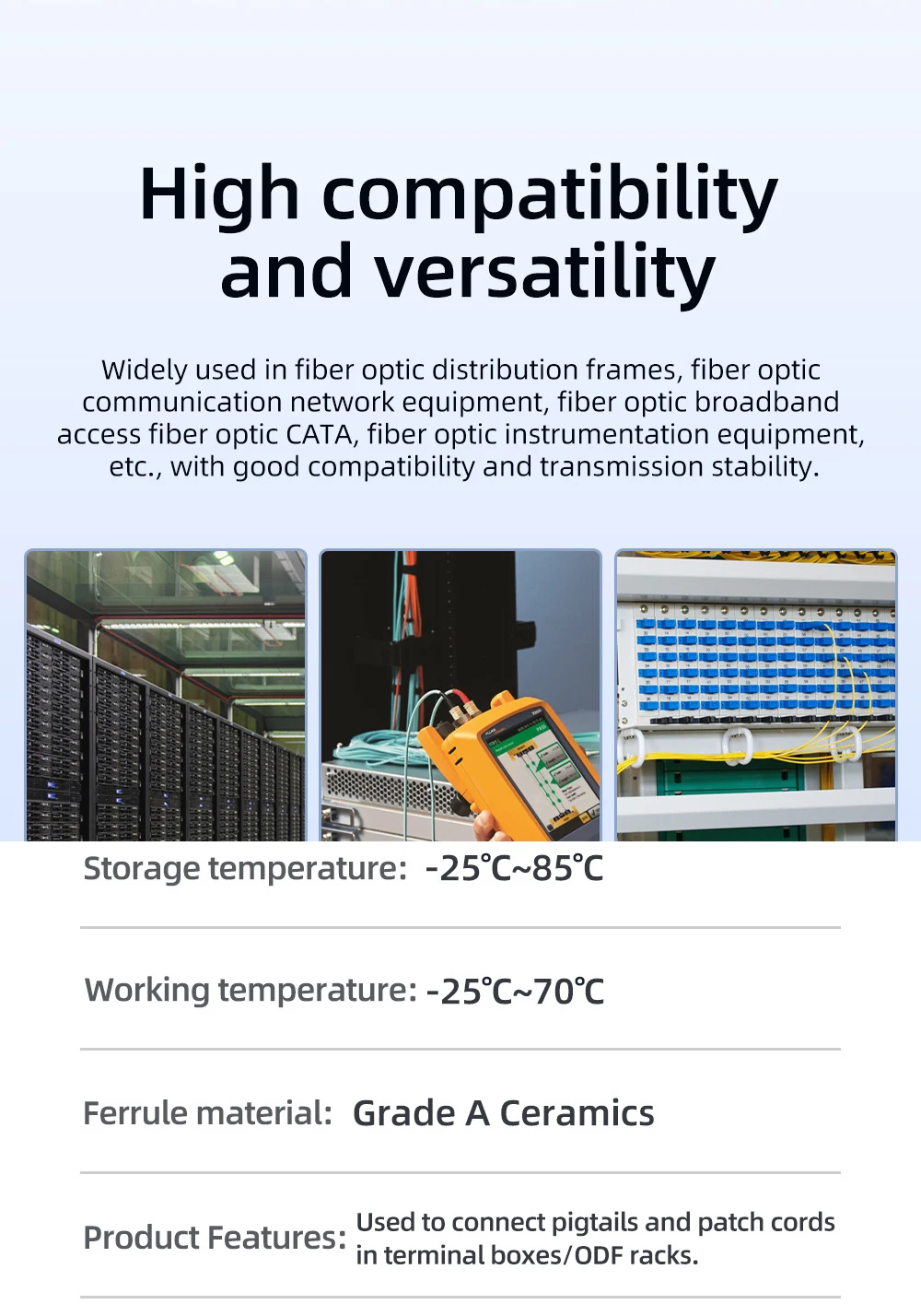 Ampliamente utilizado en cuadros de distribución de fibra óptica, equipos de redes de comunicación de fibra óptica, CATA de fibra óptica de acceso de banda ancha de fibra óptica, equipos de instrumentación de fibra óptica, etc., con buena compatibilidad y estabilidad de transmisión.
