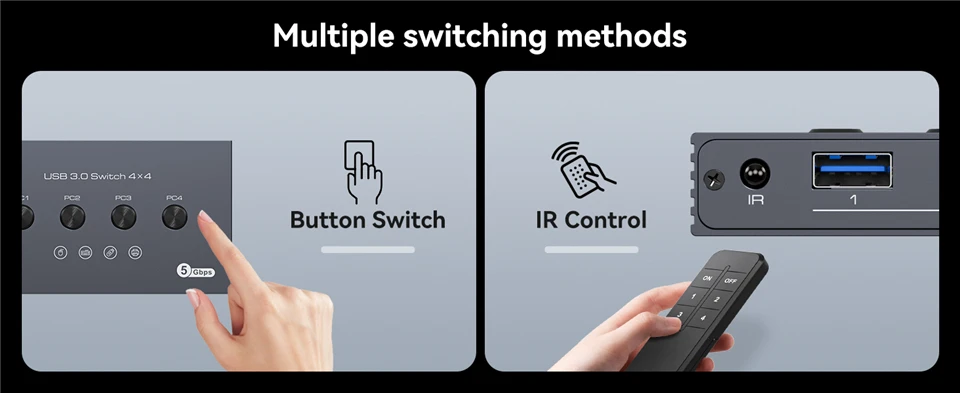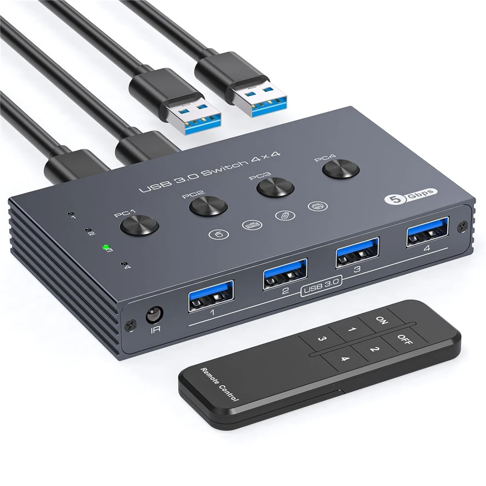 【USB 3.0 Switch 4 Computers】Navceker 4 port USB switcher supports four computers sharing four USB 3.0 peripheral devices.No need to frequently connect cables or set up complex network sharing software, just press a button or remotely control to switch between the computers you want to use.A great choice to improve your work efficiency.Note:the usb 3.0 switch not a KVM switch, does not support HDMI/DP/VGA inputs or monitor/video transfers
