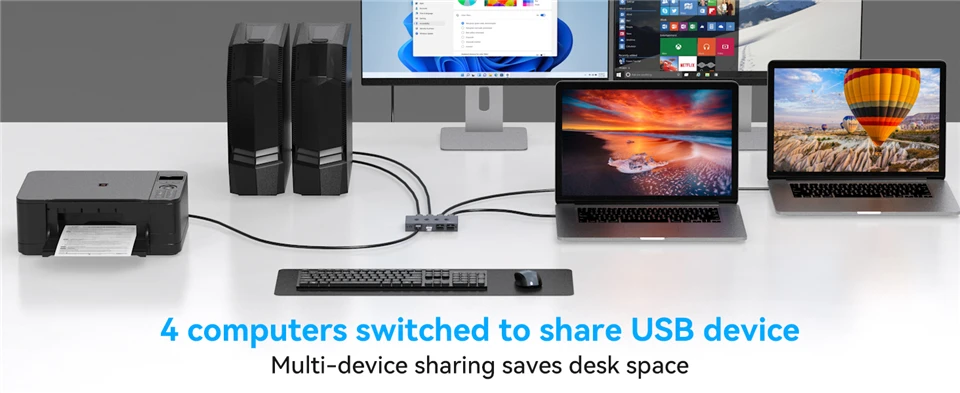 ZY-ASW202D,Navceker 4 in 4 out USB switch supports 4 computers to share 4 USB devices, including a 1 USB C port and 3 USB A ports, which supports connecting a variety of USB devices, such as keyboards, mice, printers, headphones and USB cameras. You can easily switch between your work computer and personal computer to improve work efficiency.